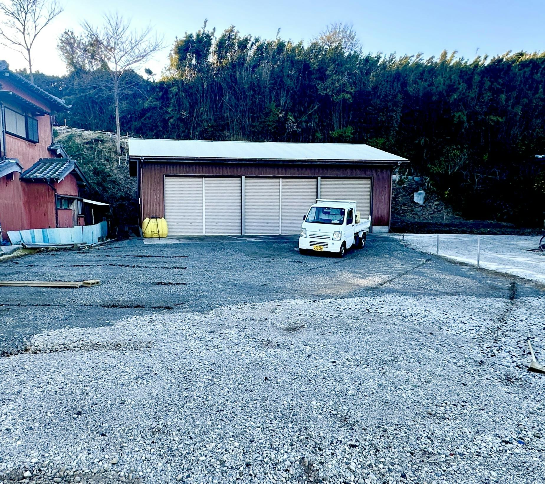 ↑拠点として整備中の駐車場と農器具倉庫。すでに水道・トイレ設置工事が完了しています。