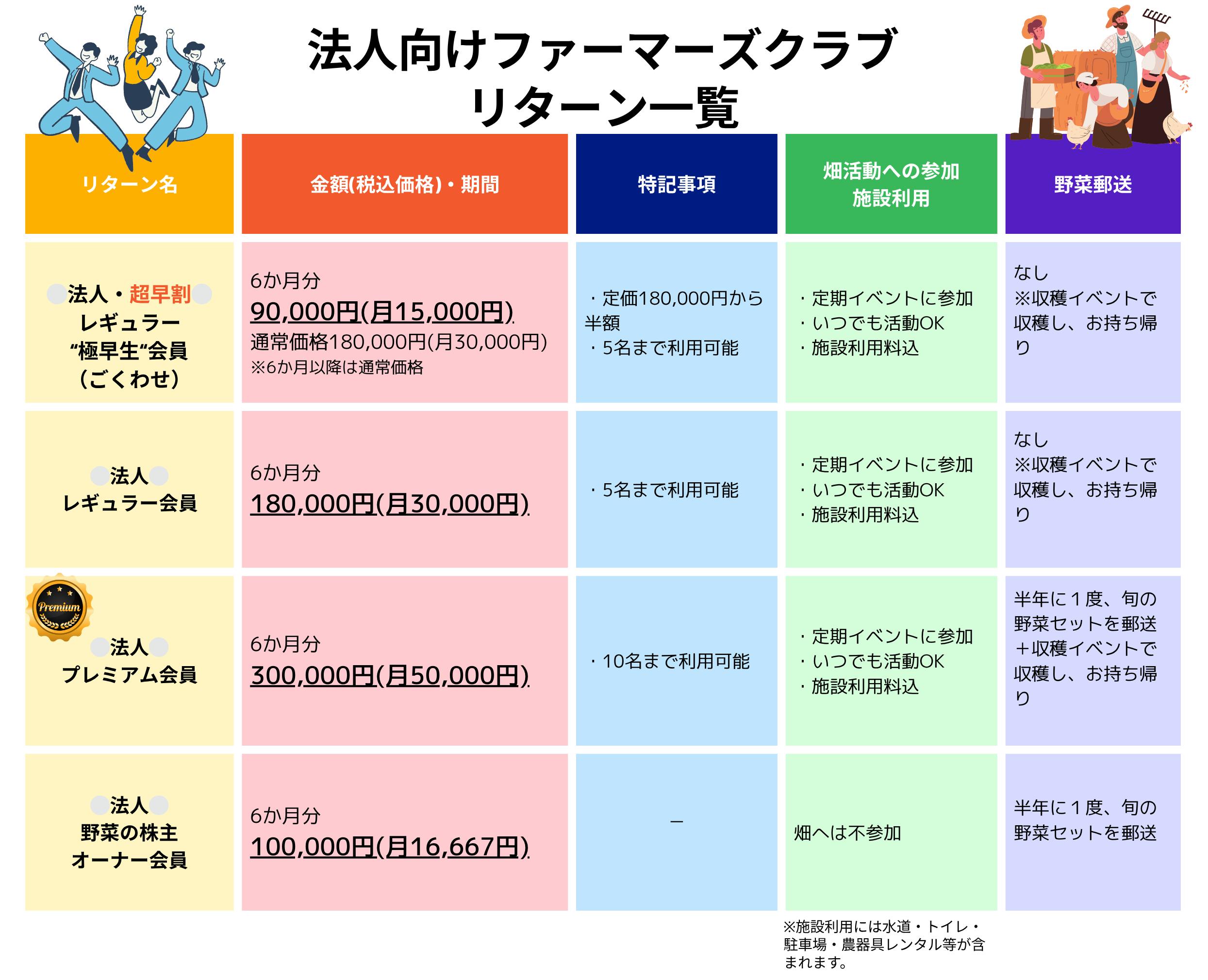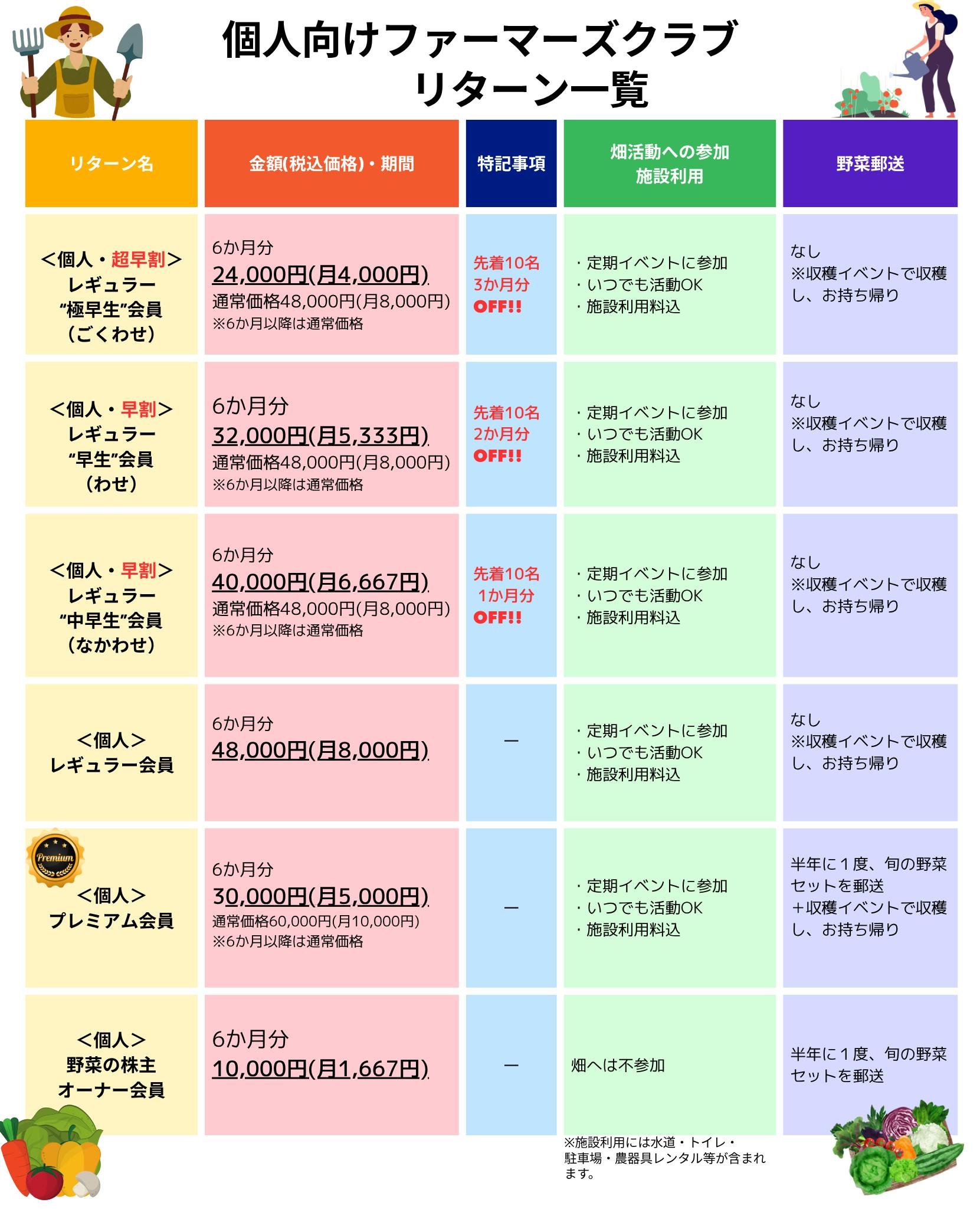30,000円/月(契約は6か月ごと)畑活動への参加・毎シーズンの畑イベントへの参加・野菜収穫・施設利用※申し込み1枠につきご利用は5名様までとなります。