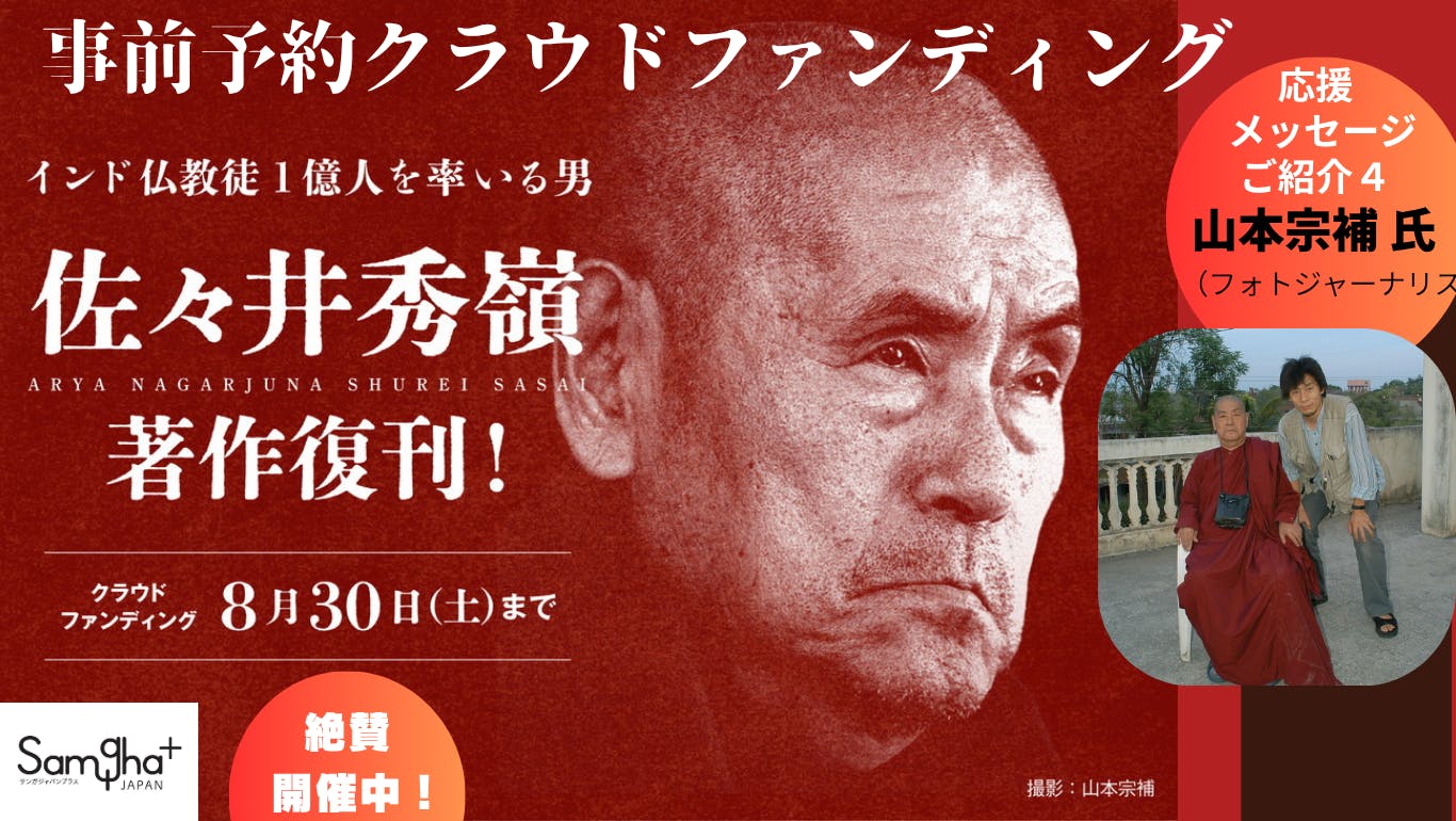 佐々井秀嶺師著作復刊のクラウドファンディングいただいたメッセージを紹介していきます。第4回は、フォトジャーナリストの山本宗補さんです。世界の問題を追う山本さんは2004年に佐々井師に出会い、以来佐々井師を撮り続けています。今回のクラウドファンディングでもとても素晴らしい佐々井師の写真をご提供くださいました。山本様ありがとうございます!