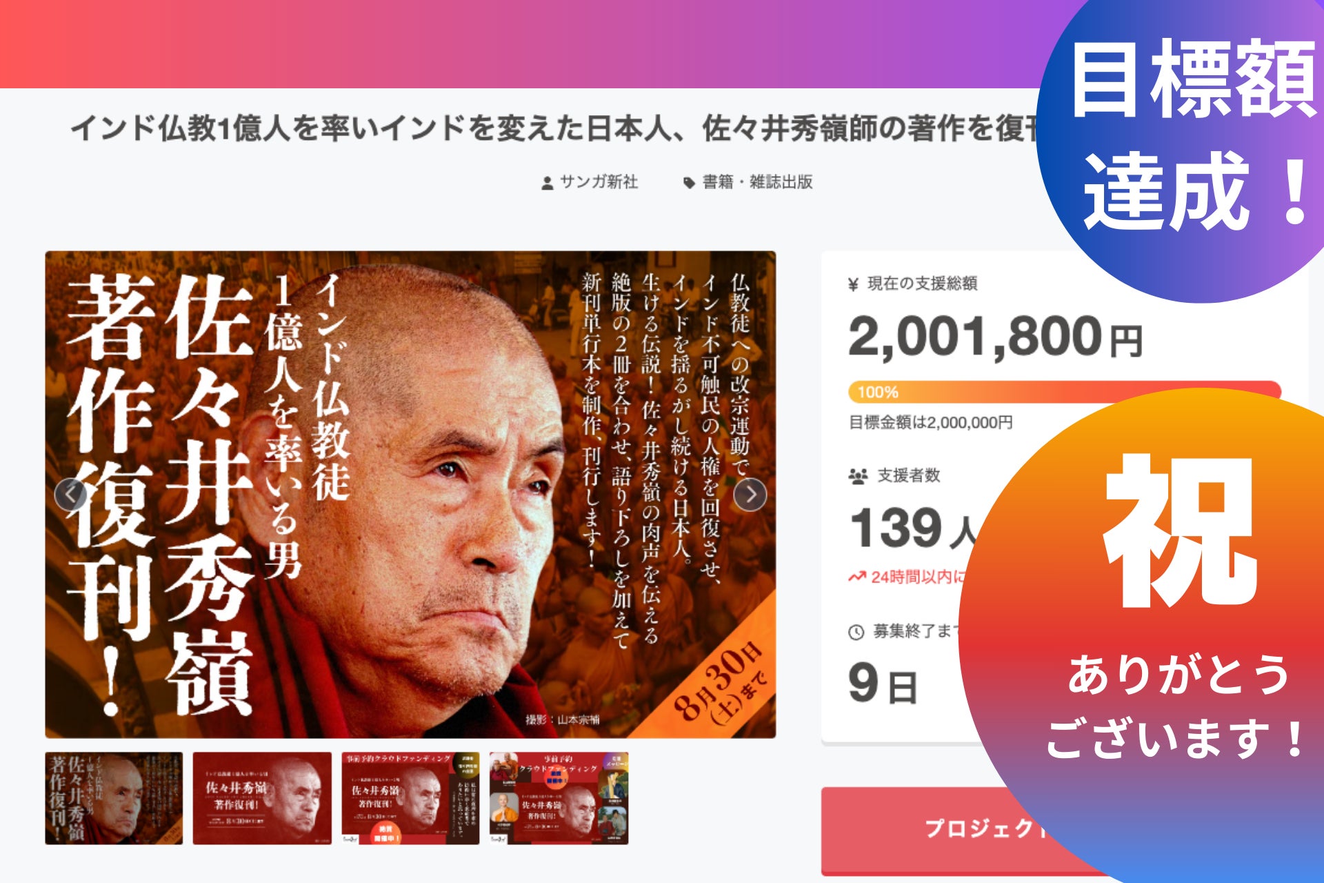 クラウドファンディングは佐々井秀嶺上人の満90歳のお誕生日である8月30日(土)23時59分まで続きます。残り9日間! 佐々井上人の著作復刊に向けてさらなるご支援をいただければ幸いです!