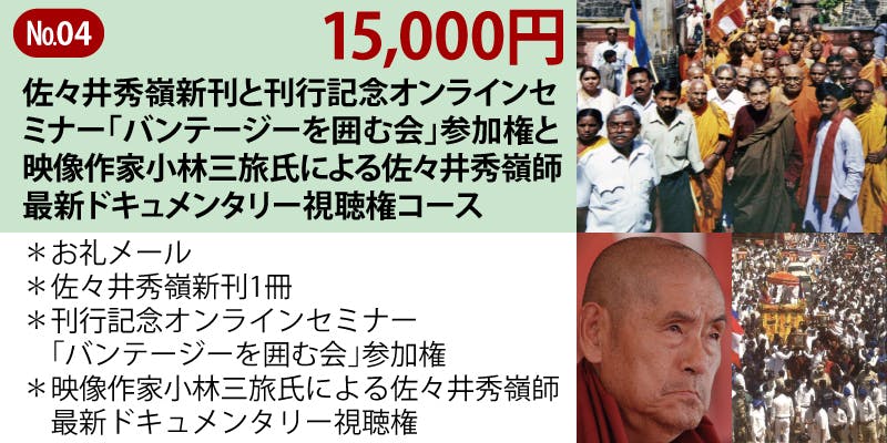 【No.04】 佐々井秀嶺新刊と刊行記念オンラインセミナー「バンテージーを囲む会」参加権と映像作家小林三旅氏による佐々井秀嶺師最新ドキュメンタリー視聴権コース15,000円