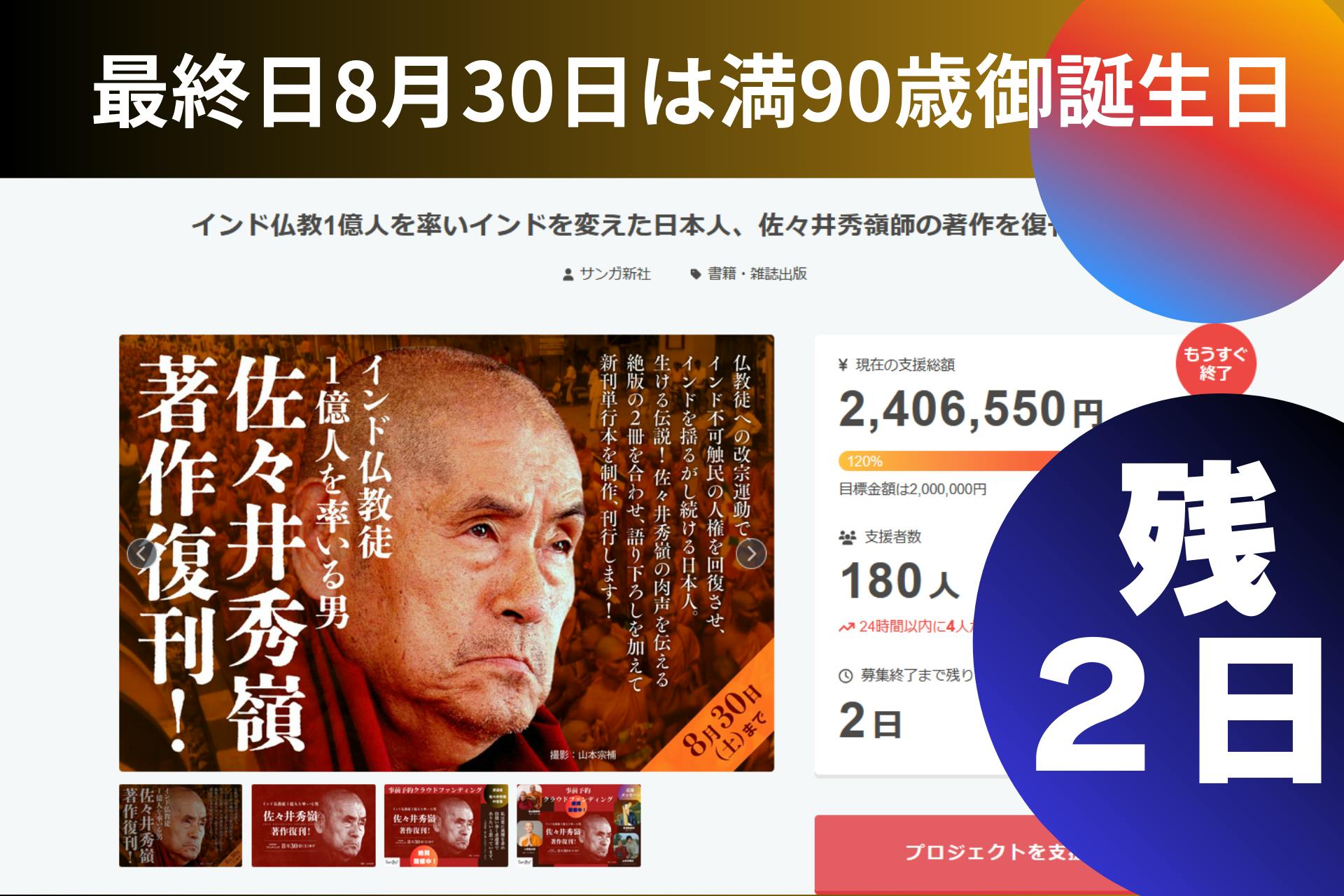 佐々井秀嶺師著作復刊クラウドファンディングも残すところ2日。お陰様で240万円を超えました。厚く御礼申し上げます。そして、最終日の8月30日は佐々井上人の満90歳の誕生日です。