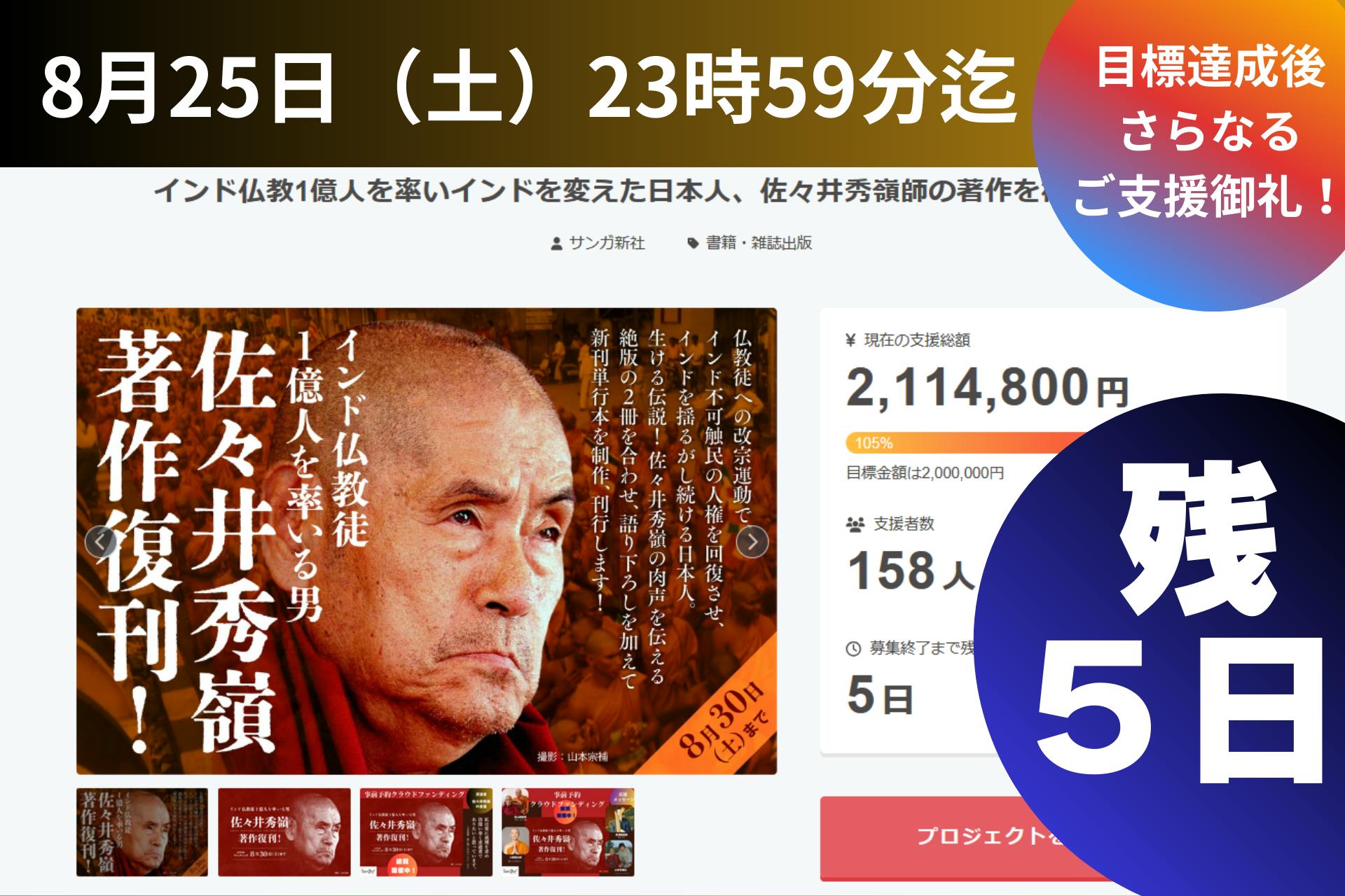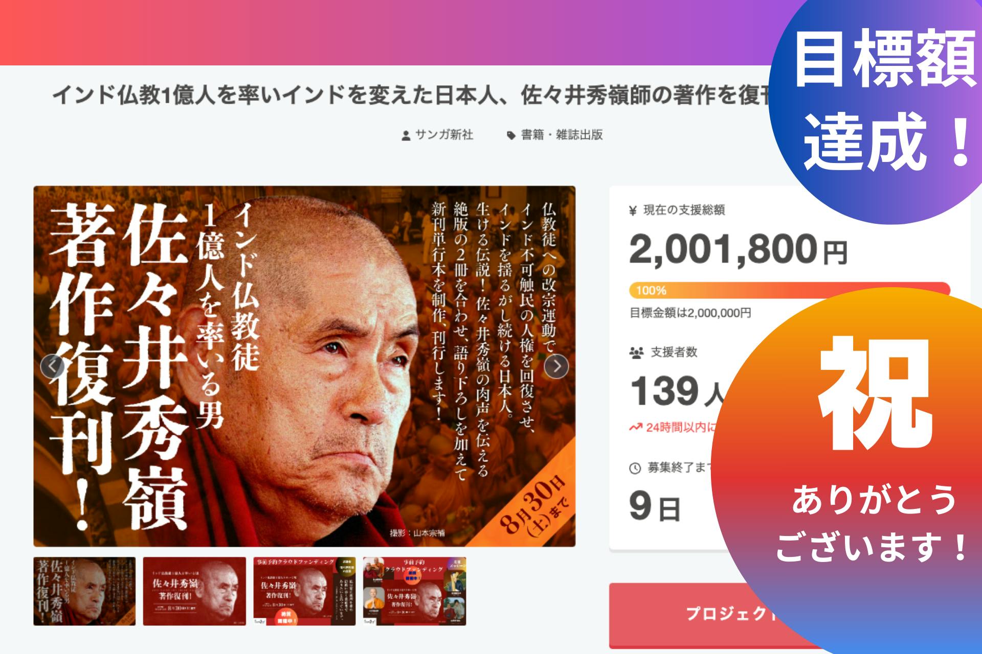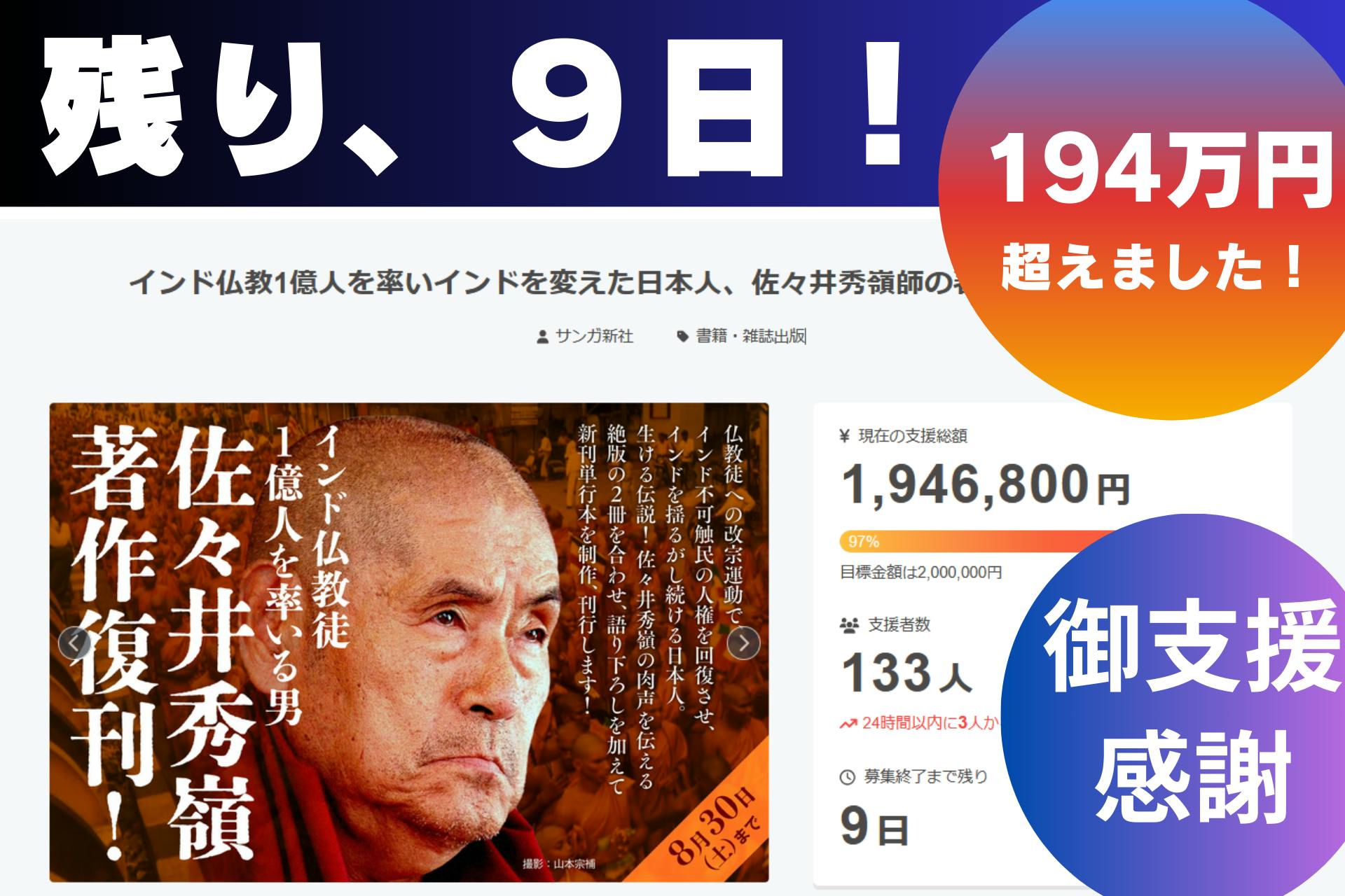 ★インド仏教1億人を率いインドを変えた日本人、佐々井秀嶺師の著作を復刊します!⇒ https://camp-fire.jp/projects/862208/preview■残2日、240万を超えました!ありがとうございます!佐々井秀嶺師著作復刊クラウドファンディングも残すところ2日。お陰様で240万円を超えました。厚く御礼申し上げます。そして、最終日の8月30日は佐々井上人の満90歳の誕生日です。クラウドファンディングは8月30日(土)23時59分までです!リターンの一つである、「バンテージーを囲む会」は、インドナグプールにおられる90歳を迎えてなおいっそう意気軒高な佐々井上人とオンラインでつないで、開くオンラインイベントです。12月開催予定ですが、具体的な開催日は決定次第、該当リターンをご支援いただいた皆様にお知らせします。※アーカイブ配信もございます。(該当リターン【№02】【№04】)【No.02】 佐々井秀嶺新刊1冊と刊行記念オンラインセミナー「バンテージーを囲む会」参加権コース7,500円【No.04】 佐々井秀嶺新刊と刊行記念オンラインセミナー「バンテージーを囲む会」参加権と映像作家小林三旅氏による佐々井秀嶺師最新ドキュメンタリー視聴権コース15,000円クラウドファンディングは8月30日まで!!ラストスパートのご支援をお願い致します!★インド仏教1億人を率いインドを変えた日本人、佐々井秀嶺師の著作を復刊します!⇒ https://camp-fire.jp/projects/862208/preview