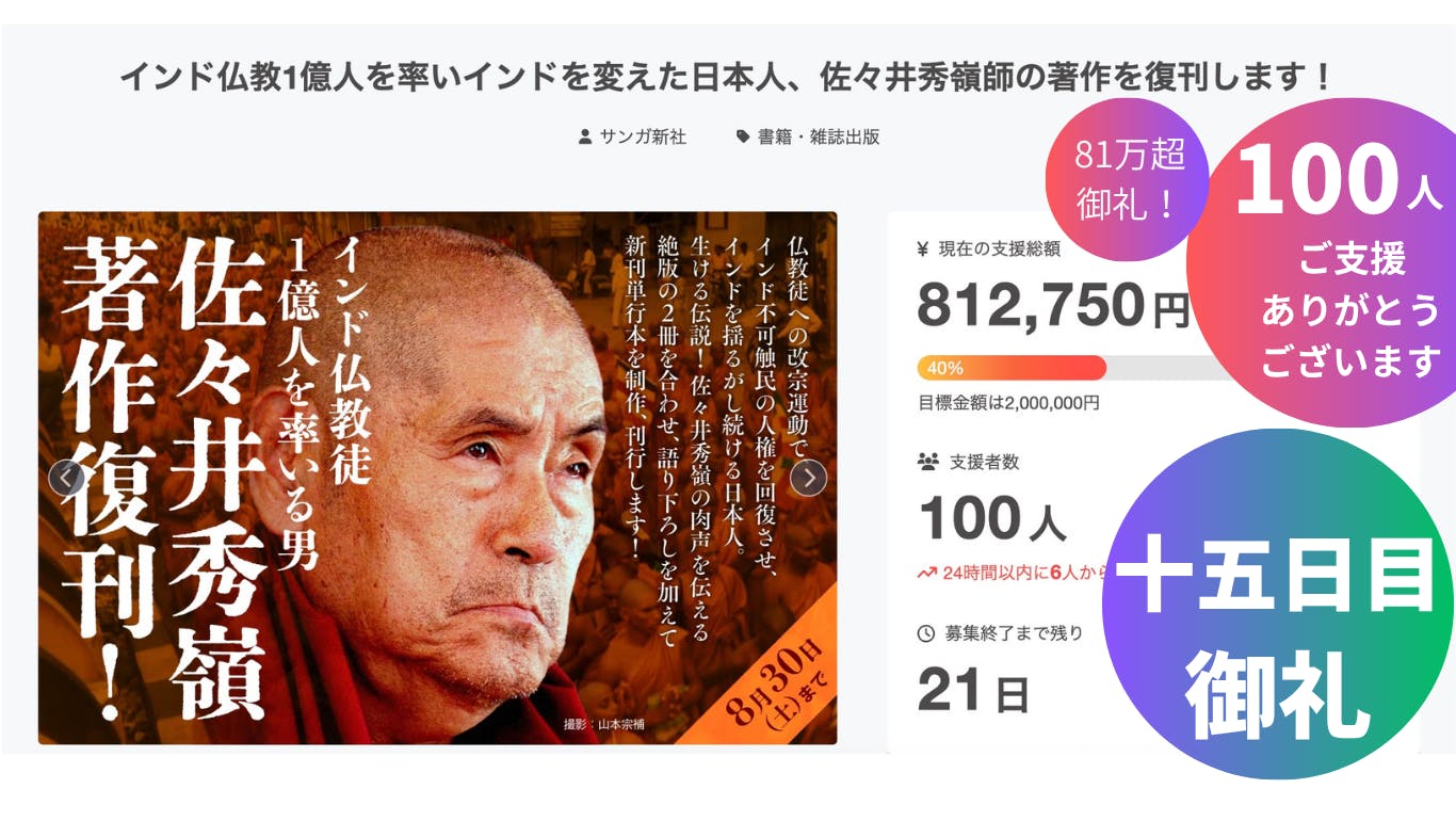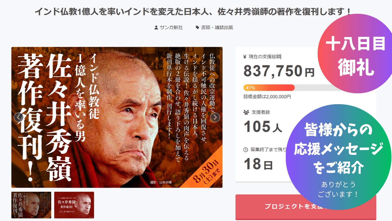 ★インド仏教1億人を率いインドを変えた日本人、佐々井秀嶺師の著作を復刊します!⇒ https://camp-fire.jp/projects/862208/previewクラファン開始から3週間が過ぎ、22日目です。残すところあと2週間と少し。最終日の8月30日は佐々井秀嶺上人(バンテージー)満90歳のお誕生日です。インドの地で90歳にしてお元気でご活躍の上人には驚嘆するばかりです。90歳を記念して書籍を復刊させていただけることは光栄の極みです。改めて皆様のご支援をお願いする次第です。■完成した書籍にお名前を掲載!書籍のクラウドファンディングならではのリターンをご用意しています。増額してご支援をいただいた方で、ご希望の方のお名前を完成した書籍に御礼の気持ちを込めて掲載させていただくものです。お名前は法人名でも結構ですし、ご希望の表記を掲載させていただきます。(公序良俗に反するペンネームは掲載をお断りする場合があります。)ご支援金額5万円、10万円、100万円の3種類をご用意しています。手数料を引いた金額の半分を書籍制作に使わせていただき、もう半分を佐々井秀嶺師の活動を支えている上人公認の支援団体、一般社団法人南天会さんに寄付させていただきます。書籍の支援をいただけると同時に、より直接的に佐々井秀嶺師の活動をサポートしていただける内容となっています。どうぞよろしくお願いいたします。 クラウドファンディングは8月30日まで続きます! 引き続きのご支援をお願い致します! ★インド仏教1億人を率いインドを変えた日本人、佐々井秀嶺師の著作を復刊します! ⇒ https://camp-fire.jp/projects/862208/preview
