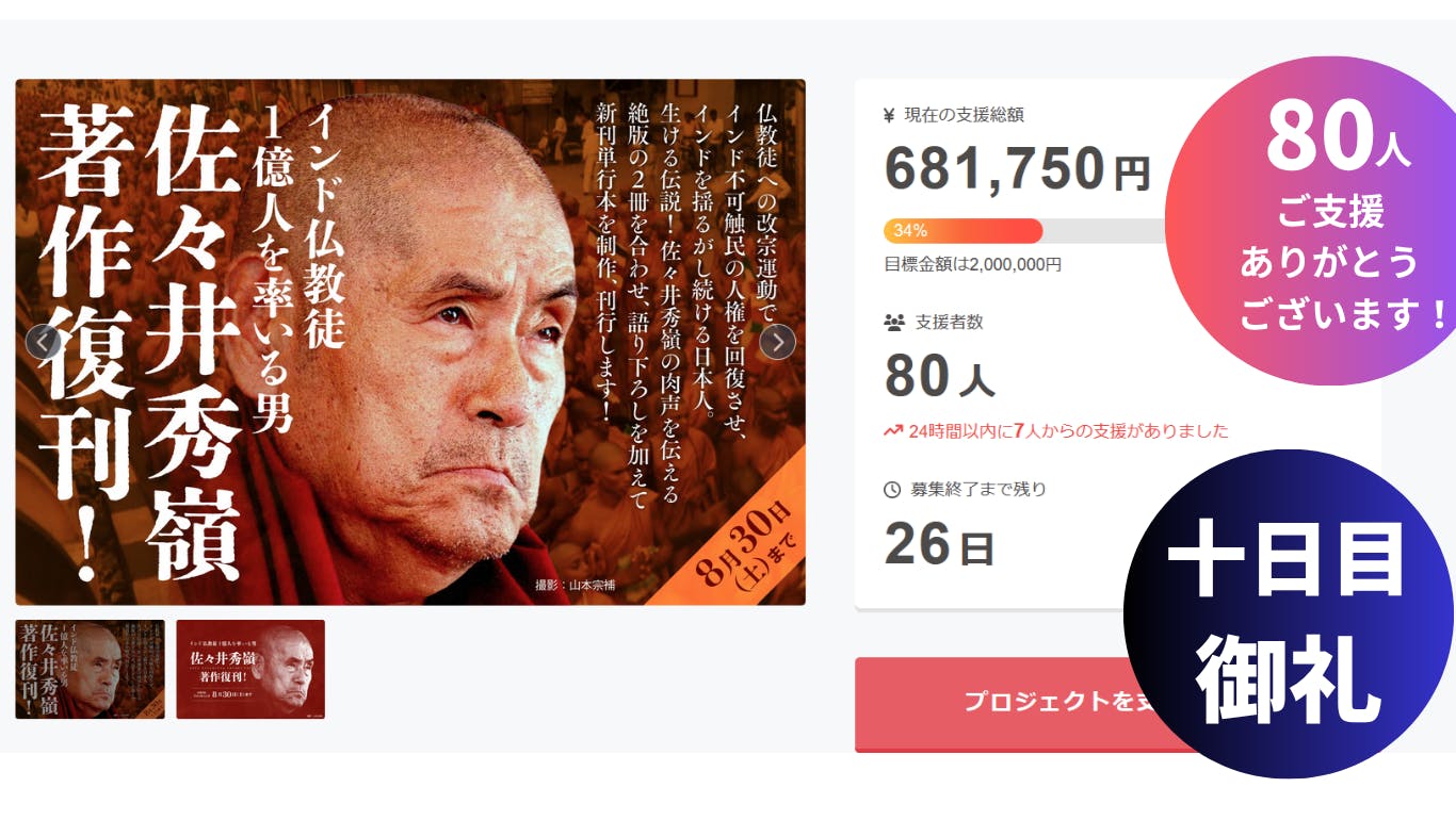 ★インド仏教1億人を率いインドを変えた日本人、佐々井秀嶺師の著作を復刊します!⇒ https://camp-fire.jp/projects/862208/preview佐々井秀嶺師著作復刊のクラウドファンディングいただいたメッセージを紹介していきます。その4佐々井秀嶺師著作復刊のクラウドファンディングいただいたメッセージを紹介していきます。第4回は、フォトジャーナリストの山本宗補さんです。世界の問題を追う山本さんは2004年に佐々井師に出会い、以来佐々井師を撮り続けています。今回のクラウドファンディングでもとても素晴らしい佐々井師の写真をご提供くださいました。山本様ありがとうございます!■メッセージ佐々井秀嶺師の存在に度肝を抜かれたのはマハトマ・ガンジー本を探していた書店で山際素男先生の著書を見つけて立ち読みした時だった。喫茶店で長時間、山際先生から叱咤激励され、嘘のような生き方をしている僧侶が本当にいるのかを確かめにインドに行ったのが2004年3月。一ヵ月密着させてもらった。佐々井師は68歳だった。(写真)振り返ると、取材を始めたのが佐々井師の若い頃でなくて良かったと思う。自分の関わりをほめるとすれば、2005年にアエラの「現代の肖像」に佐々井師の記事を書かせてもらったこと、44年ぶりの一時帰国全国行脚に随行し記録したこと、東日本大震災の被災地をご案内して各地で読経していただいたことなどだ。佐々井師の二冊の著著が一冊になる。ジャイビーム!#アンベードカル博士フォトジャーナリスト 山本宗補佐々井秀嶺師と山本宗補氏(2004年4月)■プロフィール山本宗補(やまもと・むねすけ)1953年長野県生まれ。フォトジャーナリスト。サンディエゴ・シティカレッジ(米、1979-81年)で写真の基礎を学ぶ。1985年からフィリピン、1988年からビルマ(ミャンマー)軍事政権下の少数民族や民主化闘争を取材。日本国内では「老い」と「戦争の記憶」のテーマで取材。佐々井秀嶺師の44年ぶりの一時帰国に随行し、大型写真集「日本行脚ー44年ぶりの母国64日間の全記録」(山本宗補撮影編集)を2010年に限定出版。主著;『戦後はまだ・・・刻まれた加害と被害の記憶』(彩流社)で平和・協同ジャーナリスト基金賞奨励賞受賞、2013年。最新刊に、『鎮魂と抗いの12年』(彩流社)、『鎮魂と抗い――3・11後の人びと』(彩流社)、『ビルマの大いなる幻影』(社会評論社)、『世界の戦場から:フィリピン』(岩波書店)、『また、あした 日本列島 老いの風景』(アートン)。共著に『「戦地」に生きる人々』(集英社新書ほか多数。■クラウドファンディングご支援お願いします!クラウドファンディングは8月30日まで続きます!引き続きのご支援をお願い致します!★インド仏教1億人を率いインドを変えた日本人、佐々井秀嶺師の著作を復刊します!⇒ https://camp-fire.jp/projects/862208/preview