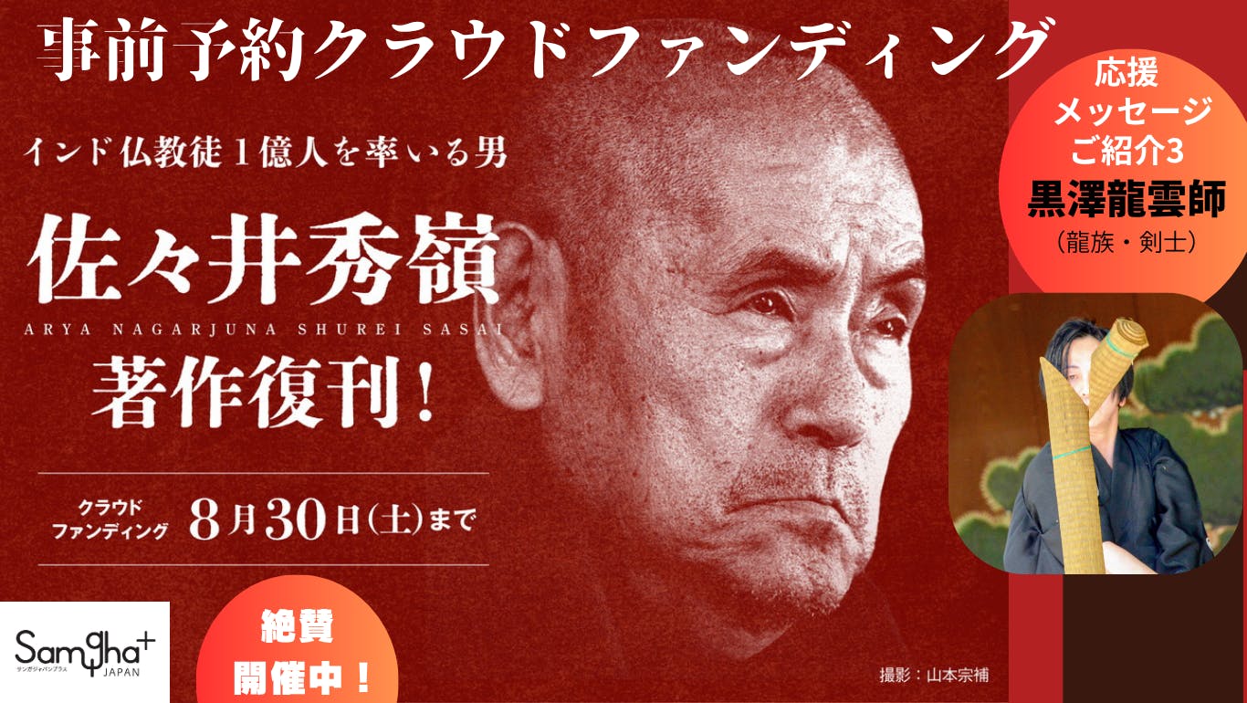 ★インド仏教1億人を率いインドを変えた日本人、佐々井秀嶺師の著作を復刊します!⇒ https://camp-fire.jp/projects/862208/preview佐々井秀嶺師著作復刊のクラウドファンディングいただいたメッセージを紹介していきます。その3佐々井秀嶺師著作復刊のクラウドファンディングいただいたメッセージを紹介していきます。第3回は、剣士の黒澤龍雲師です。黒澤師の流派「殺活自在流剣法」は佐々井秀嶺師により命名されたそうです。そのこころは〈「殺」は「捨てる」こと、「捨てさせる」働きのことであり、「活」とは「獲得する」こと、「手に入れて我がものとさせる」働き」〉〈「その場、その時に応じて自在であり、「生死一如」で、とらわれがない心」〉(https://butokuin.jp/)とのこと。龍雲様、メッセージをありがとうございます。■メッセージ我が師 佐々井秀嶺師の著作復刊のクラウドファウンディングによせて佐々井秀嶺師(バンテジー)と私との出会いは、2009年にバンテジーが44年ぶりに祖国の地を踏んだとき、御前にて奉納演武をさせていただき、ご覧になったバンテジーが、「剣をふるうお前から龍が雲に向かって飛び、一体となっていた」とおっしゃり、「お前の名前は龍雲だ」と剣士としての名をいただいて以来、はや16年である。バンテジーの過去の著作が復刊されるのは大変喜ばしく、特に混迷の度合いを増してきた世界情勢のなか、日本人の先達が異国の地で特異なエネルギーを発散しながら活動し続け、菩薩道を実践している姿を知り、生きる指針としてほしいと切に願っております。日本武徳院 殺活自在流剣法師範・剣士 黒澤龍雲■プロフィール黒澤龍雲(くろさわ・りゅううん)日本武徳院 殺活自在流剣法 創始師範。1968年 横浜市出身、日本大学芸術学部卒業。曽祖父がアイルランド人で、1/8アイルランドの血が流れている。6歳より剣の道を志し、1998年、30歳で型、試斬、それらを貫く心の鍛錬を軸に据えた自身の道場「日本武徳院 試斬居合道」を創立する。2018年、道場設立20周年を機に、道場名を「日本武徳院 殺活自在流剣法」に、剣名も俗名の黒澤雄太より黒澤龍雲へとあらためる。これらはインド仏教最高指導者であり、師でもある佐々井秀嶺師の命名による。現在、横浜で二ヶ所の道場を開き、5歳から80代の幅広い男女が通う。また、道場の活動だけに止まらず、演武や講演などにも積極的に力を入れている。パリ カルティエ現代美術財団、ポンピドゥーセンタ― メスなどフランスでの演武をはじめ、スイス モントルーにおいて日本とスイス国交樹立150周年記念演武や、インド ナグプール「龍樹菩薩大寺」落慶記念奉納演武など、海外での演武も多い。国内では、スウェーデン グスタフ国王夫妻御前演武や、ルーブル美術館館長来日時の演武、藤子不二雄A先生の漫画家生活50周年記念演武、BS11「歴史科学捜査班」出演など、ひろく武の心を伝えるべく活動している。2008年、初の著作『真剣』が光文社新書から出版。2014年、真言宗大覚寺派の田谷山 定泉寺にて授戒する。刀剣の美術的知見については、佐野美術館館長の渡邉妙子先生の薫陶を受けている。https://butokuin.jp/■クラウドファンディングご支援お願いします!クラウドファンディングは8月30日まで続きます!引き続きのご支援をお願い致します!★インド仏教1億人を率いインドを変えた日本人、佐々井秀嶺師の著作を復刊します!⇒ https://camp-fire.jp/projects/862208/preview