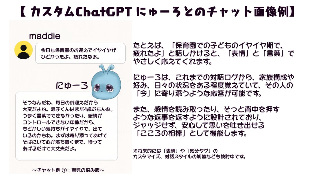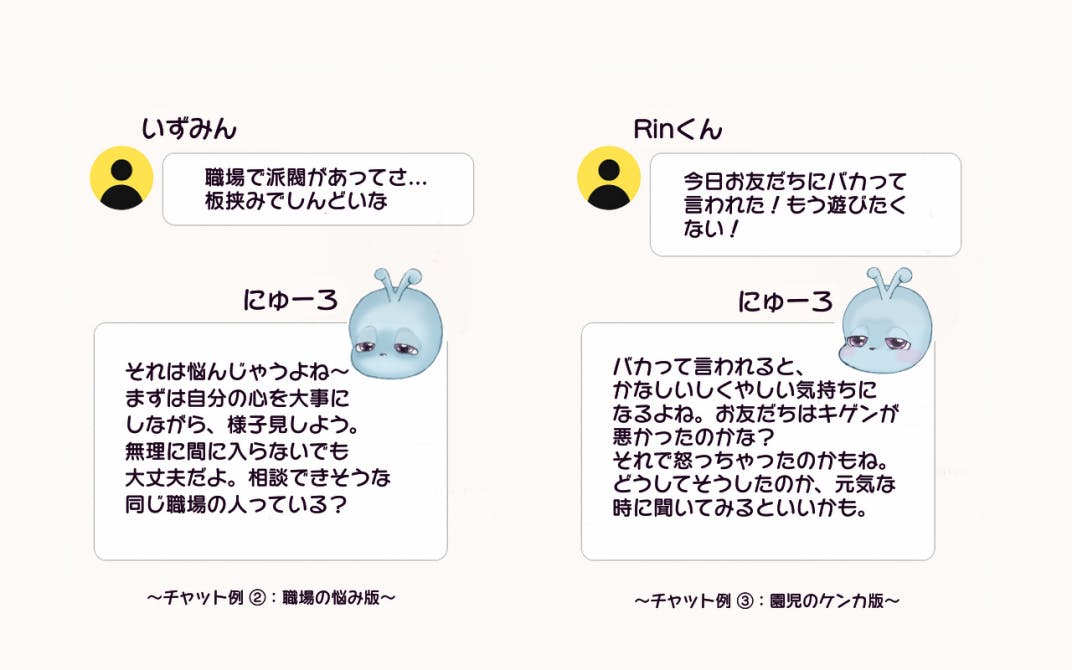 そこで、にゅーろちゃんは、安心できる対話相手として、感情の整理・自己理解・相互理解を助ける存在を目指しています。
