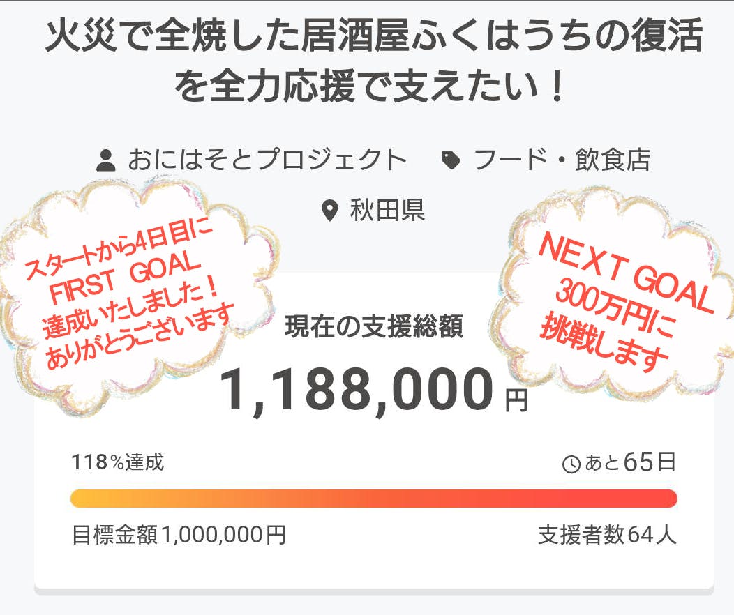 しかしながら、まだまだご支援が必要な状況であります。クラウドファンディング終了まで65日の期間、さらなるふくはうち新店舗の宣伝と集客に繋げるべく、ネクストステージ目標金額300万円にチャレンジすることを決意いたしました。