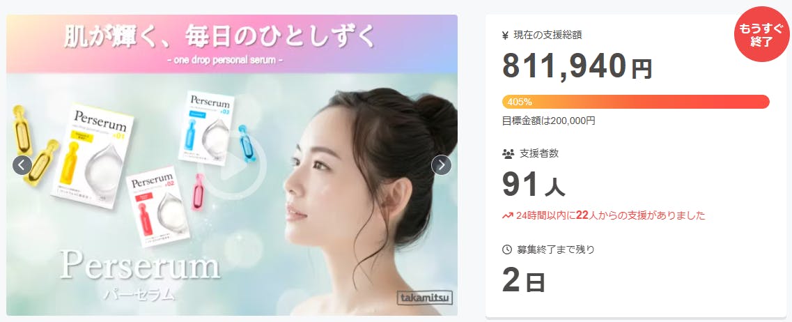 「Perserumプロジェクト」10/26(日)の募集終了まで残り2日となりました。終了が近づいておりますが、多くのご支援をいただきまして大変感激しております。ありがとうございます!さらに多くの方々にぜひ限定価格でお試しいただけますよう、ラストスパート、精一杯頑張ってまいります。引き続き、応援のほどよろしくお願いいたします。