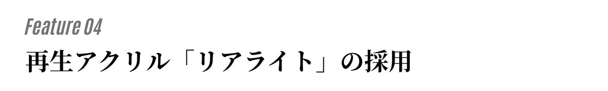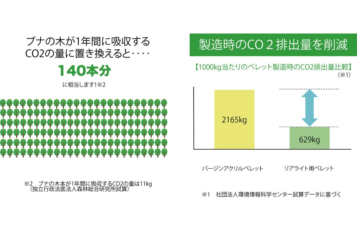 素材は再生アクリル「リアライト」(再生原料80%)。CO₂排出も大幅削減