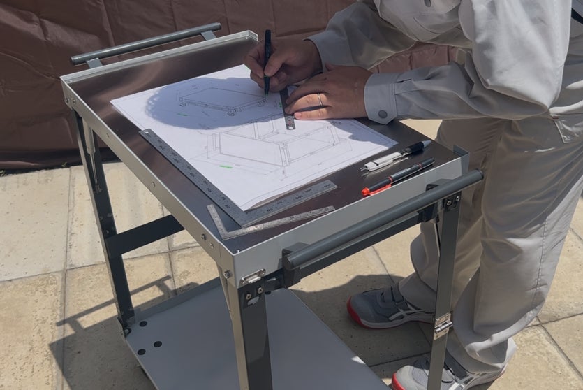 ・ステンレスの天板と3方のみの落ち止めによって現地で使う机として使いやすさを追求。