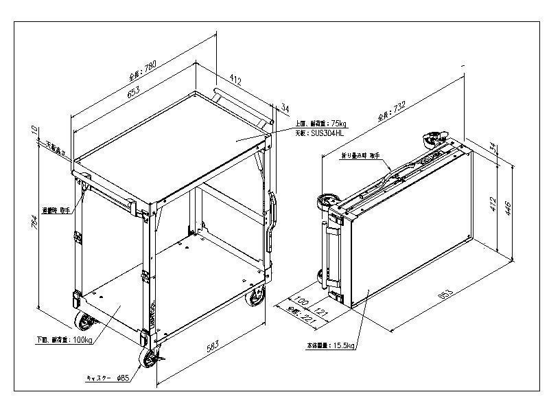重量:15.5kg 耐荷重上面:70kg、下面:100kg(ただし、上面、下面の総重量は100kgまで)