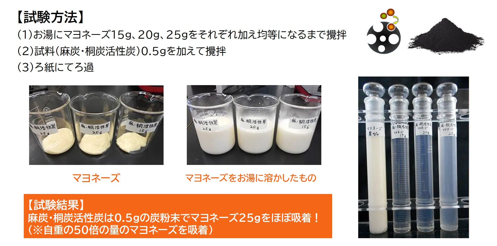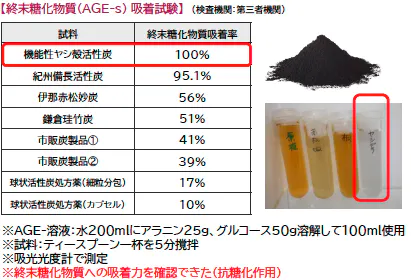 ヤシ殻由来の活性炭ヤシ殻特有の性質を活かし、終末糖化物質(AGEs)の吸着率100%を実現。