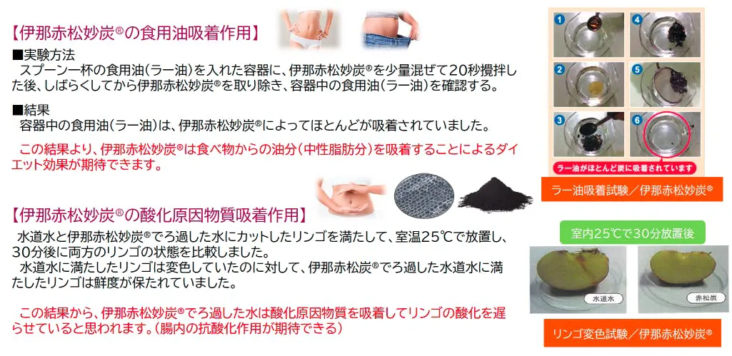 伊那赤松妙炭Ⓡは、多孔質の炭ならではの表面構造をもち、油分など一部の成分と物理的に絡みやすい性質が確認されています。食事とともに取り入れやすい点に着目し、日々のコンディションづくりを意識する方のリズムにフィットする素材として採用しました。原料由来により、摂取後に便の色が黒っぽく見えることがあります。