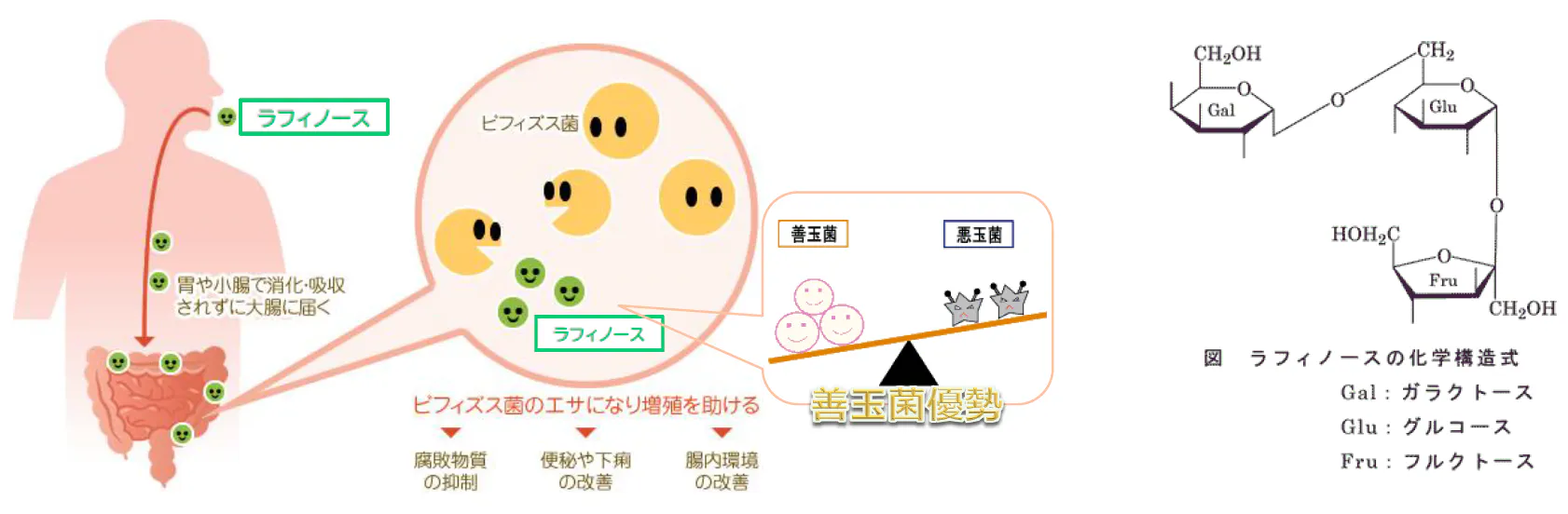 ラフィノースは、北海道産の甜菜(砂糖大根)から抽出・精製された高純度(98%以上)の天然オリゴ糖で、3糖類(ガラクトース、グルコース、フルクトース)から構成されています。大腸に届くと、善玉菌であるビフィズス菌の増殖を促進し、悪玉菌(大腸菌やウェルシュ菌など)の活動を抑制することで、善玉菌優勢の健康的な腸内環境を作り出します。