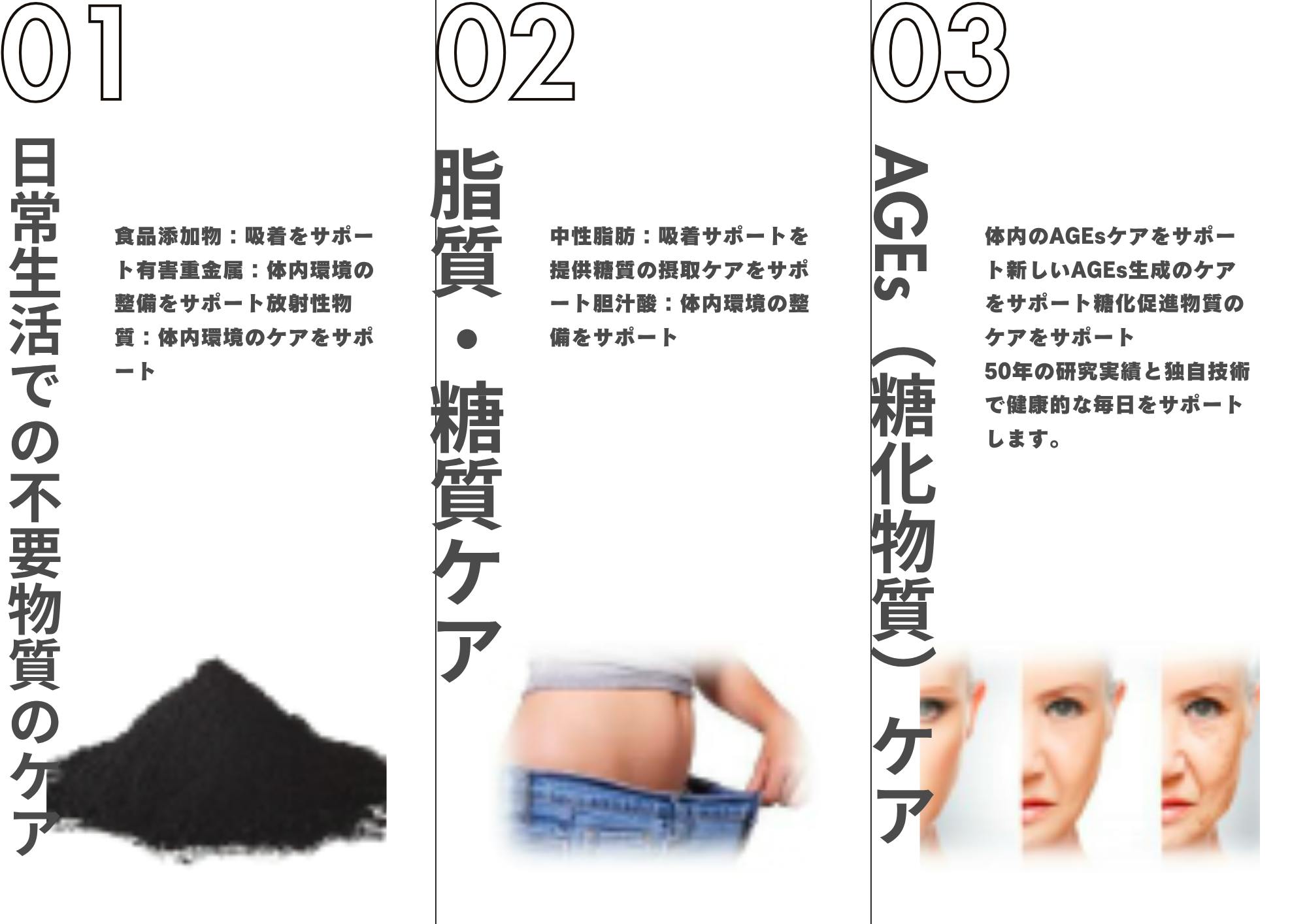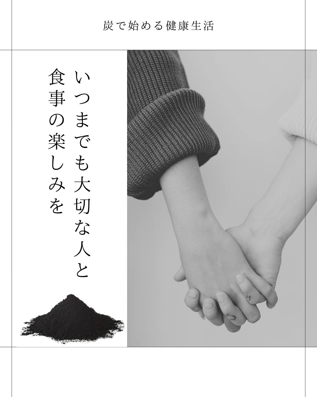 炭プラスラボ社と信州大学・田中教授らによる基礎研究を通じて素材特性を検討し、偏りがちな食生活を見直したい方の毎日に寄り添う設計に活かしています。記載の内容は素材や原料の一般的な性質・試験結果に基づく説明です。