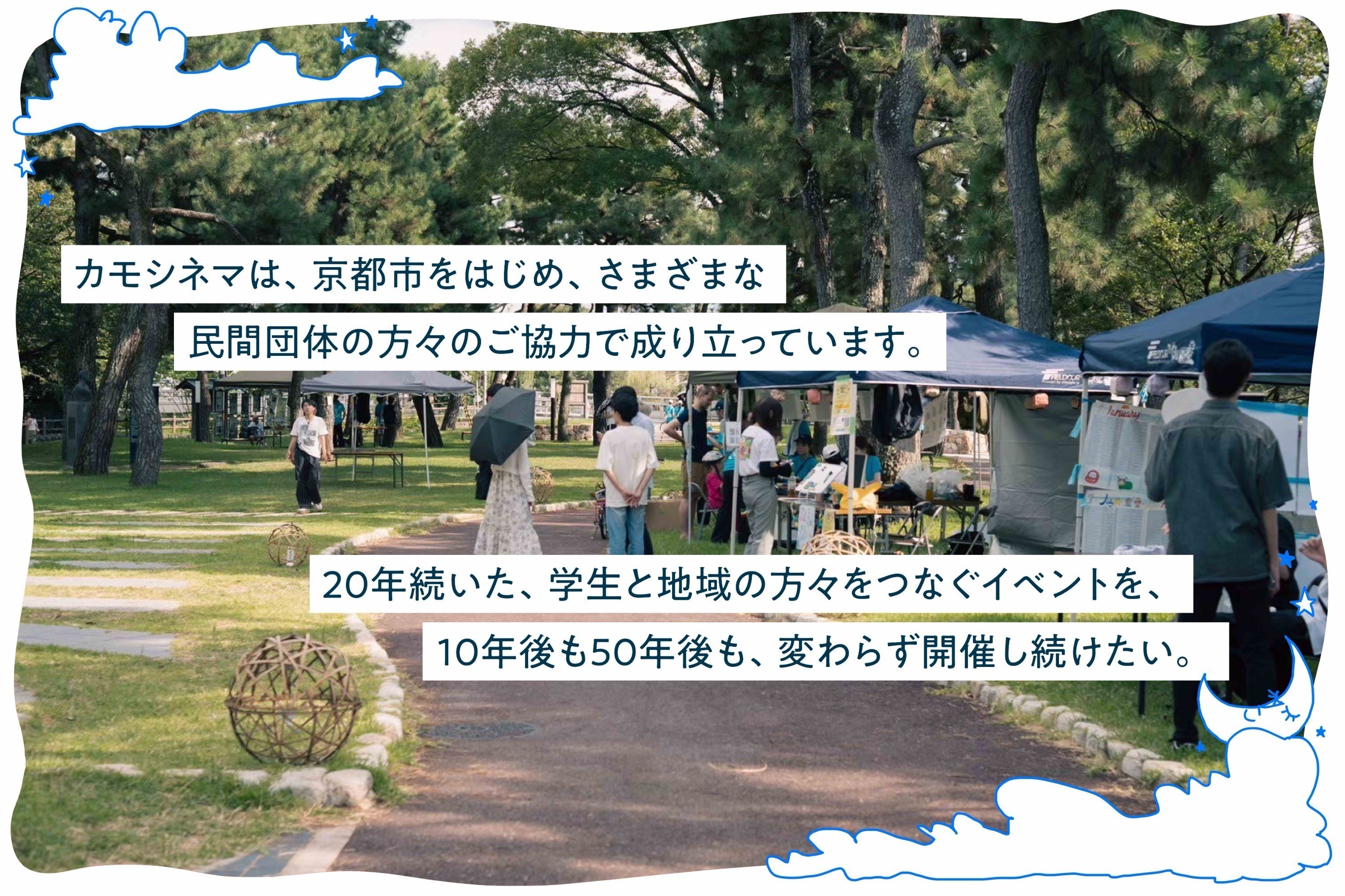 私たちはこれまで、映画を通じて鴨川と人々とをゆるやかに繋ぐ場をつくってきました。 この灯りを絶やさぬよう、そして来年もまた鴨川のほとりで映画を楽しんでいただけるように、皆さまのお力をぜひお貸しください。