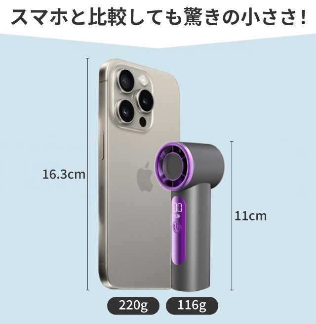 高さたったの11cmと業界最小クラスになります。毎日持っているスマホサイズより約40%も小さいサイズになります。 ハンディファン扇風機として最小クラスとなります。