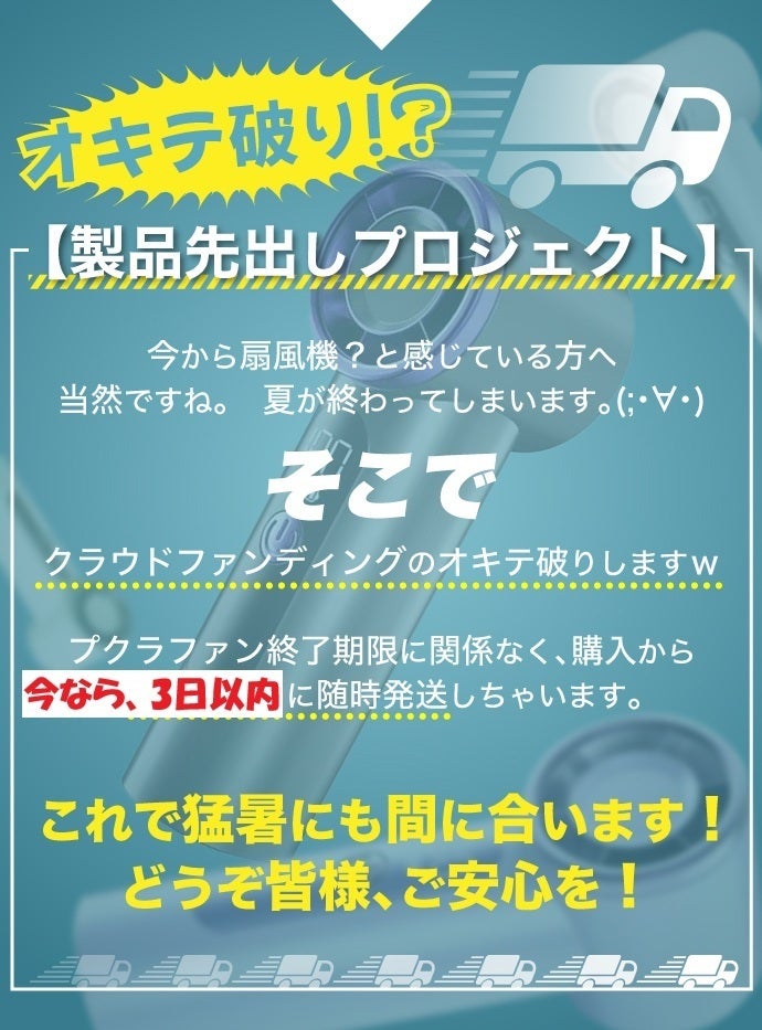 2025/09/18 10:00皆さま、いつもご支援ありがとうございます!これまで当プロジェクトでは、クラウドファンディングでは異例の終了日を待たずに**「3週間以内発送」**を実現し、多くの方にご好評をいただいてきました。しかし今回、さらに“オキテ破り”の新体制へ——**「ご支援から3日以内で発送」**を一部リターンにて実施開始! 支援から最短3日でお届け!これまでの3週間以内発送をさらに短縮し、なんと3日以内発送の体制を整備いたしました。 残暑が続く今だからこそ、「早く手元に欲しい」という声に即応したスピード対応です。なお、対応できる在庫数には限りがあるため、最新の発送対応状況は活動報告を通じて随時お知らせいたします。 残暑対策、まだ間に合います!例年にない長い残暑が続いている今年、「でか冷却」体験が今からでも実感できる最後のチャンス。すでに体験された方からは:「このサイズでこの風量はすごい」「鞄にもポケットにも入って持ち運びがラク」「通勤やオフィスのデスクで大活躍!」「付属のロングネックストラップが便利でかわいい」…といったリアルな声が届いています。 数量限定・先着順でご案内中3日以内発送はカラー/数量限定ご希望の方はお早めにご支援を!発送対応可能な在庫数は今後の活動報告で逐次ご案内「すぐ使いたい!」という方にこそ、今が最適のタイミングです。ぜひ、この機会をお見逃しなく! もっと見る