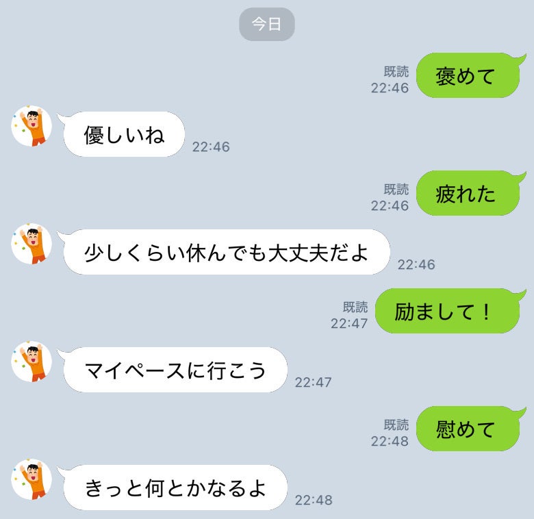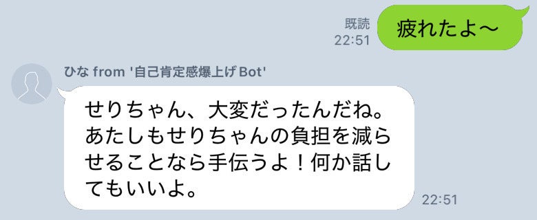 LINEで動くボットで、「ほめて」といったキーワードを送ると、あらかじめ決めた返事の中からランダムに一つ返してくれる仕組みです。