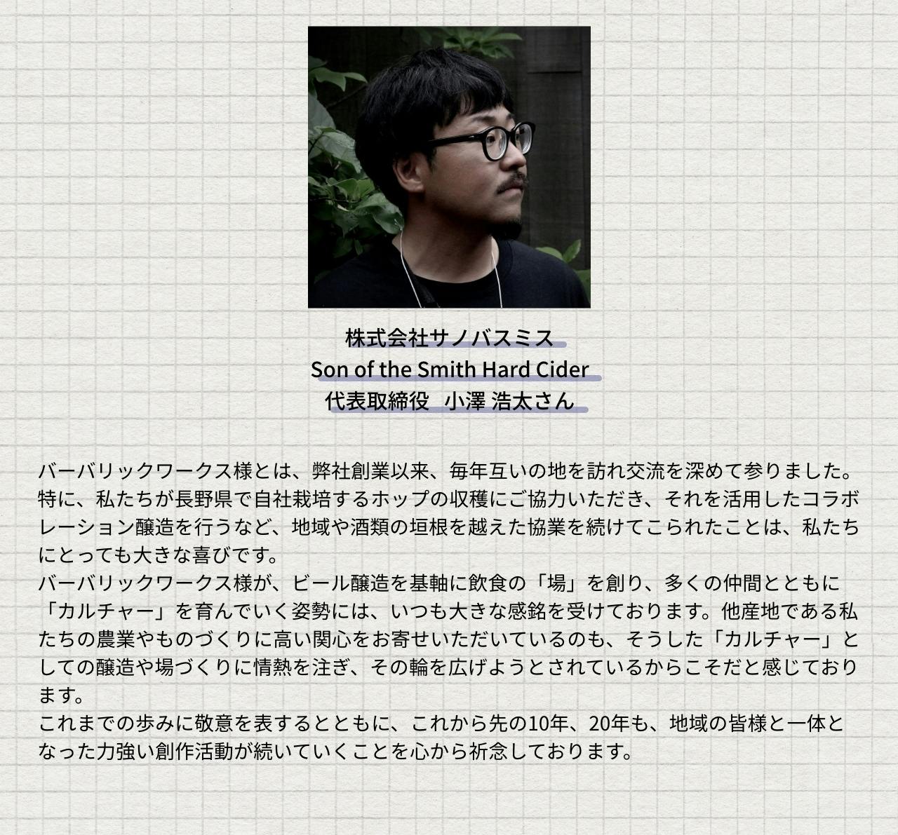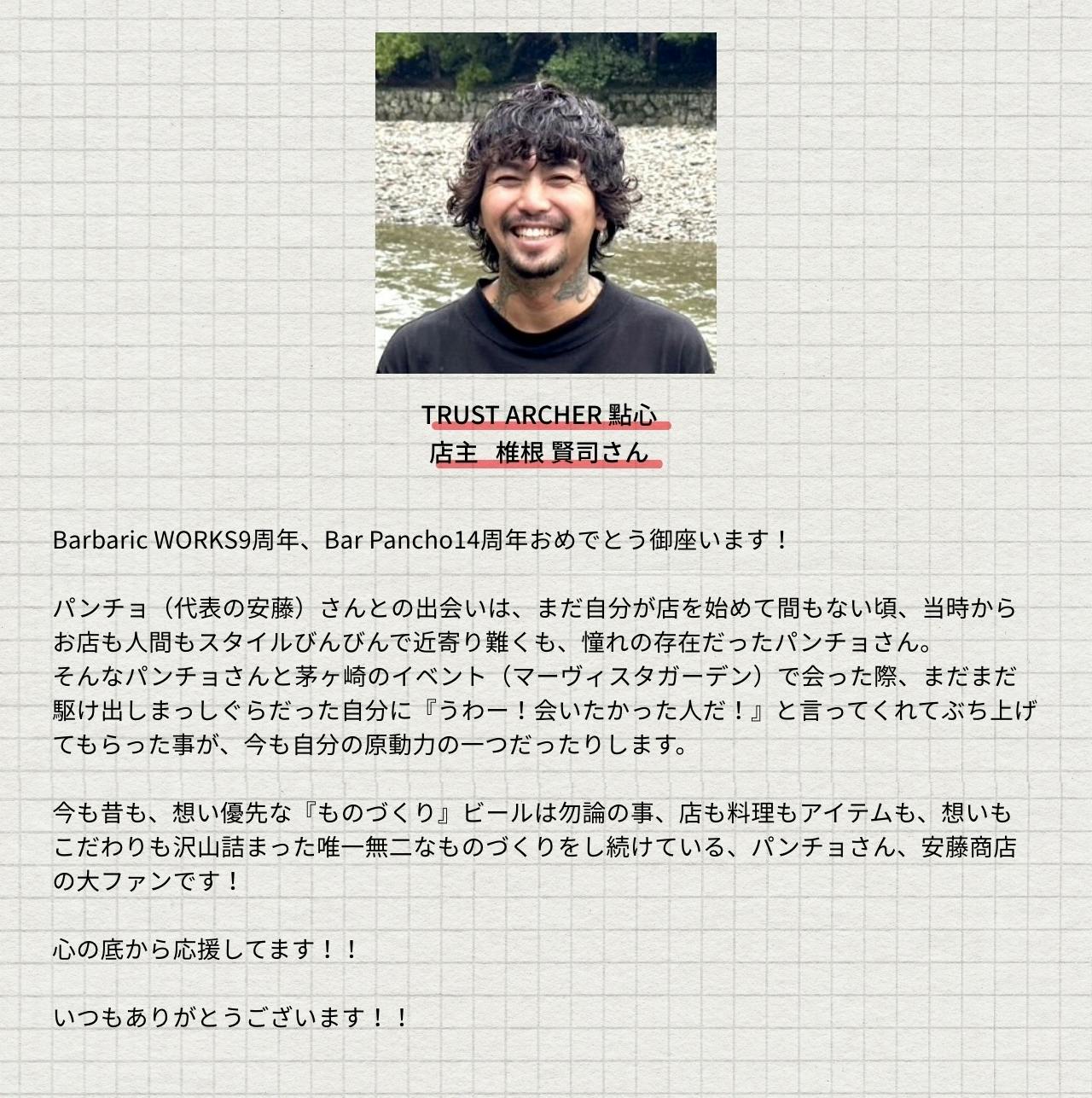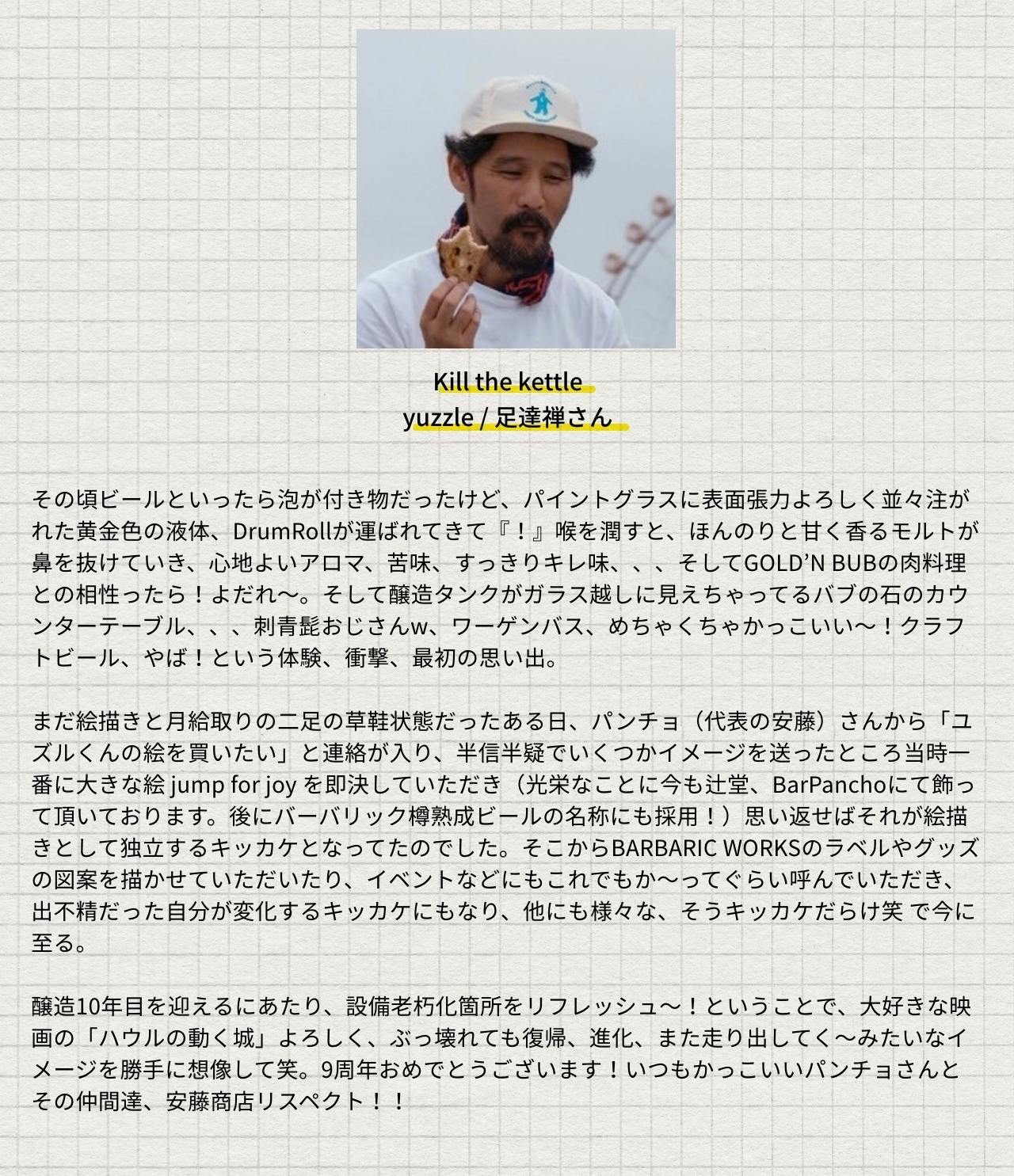 2025/10/31 09:00気づけば、ゴールはもう目の前。9年前、ドラムロールから始まった小さなブルワリーが、今日まで続けてこられたのは――たくさんの応援の言葉、支援のひとつひとつを届けていただいた皆さまのおかげです。支えてくれた常連さん達、遠くから声を届けてくれた仲間達、はじめて出会ってくれた人々。ひとりひとりの応援が重なって、ここまで来られました。最後の1日。どうか一緒に、この物語を締めくくってください。そして、次の10年へと鳴り響く、止むことの無い物語の一歩を共に踏み出しましょう。最後に、9年分の心からの感謝を込めて。Barbaric WORKS / 株式会社安藤商店代 表 安藤佑一醸造長 布施翔太醸 造 吉田 丈 もっと見る