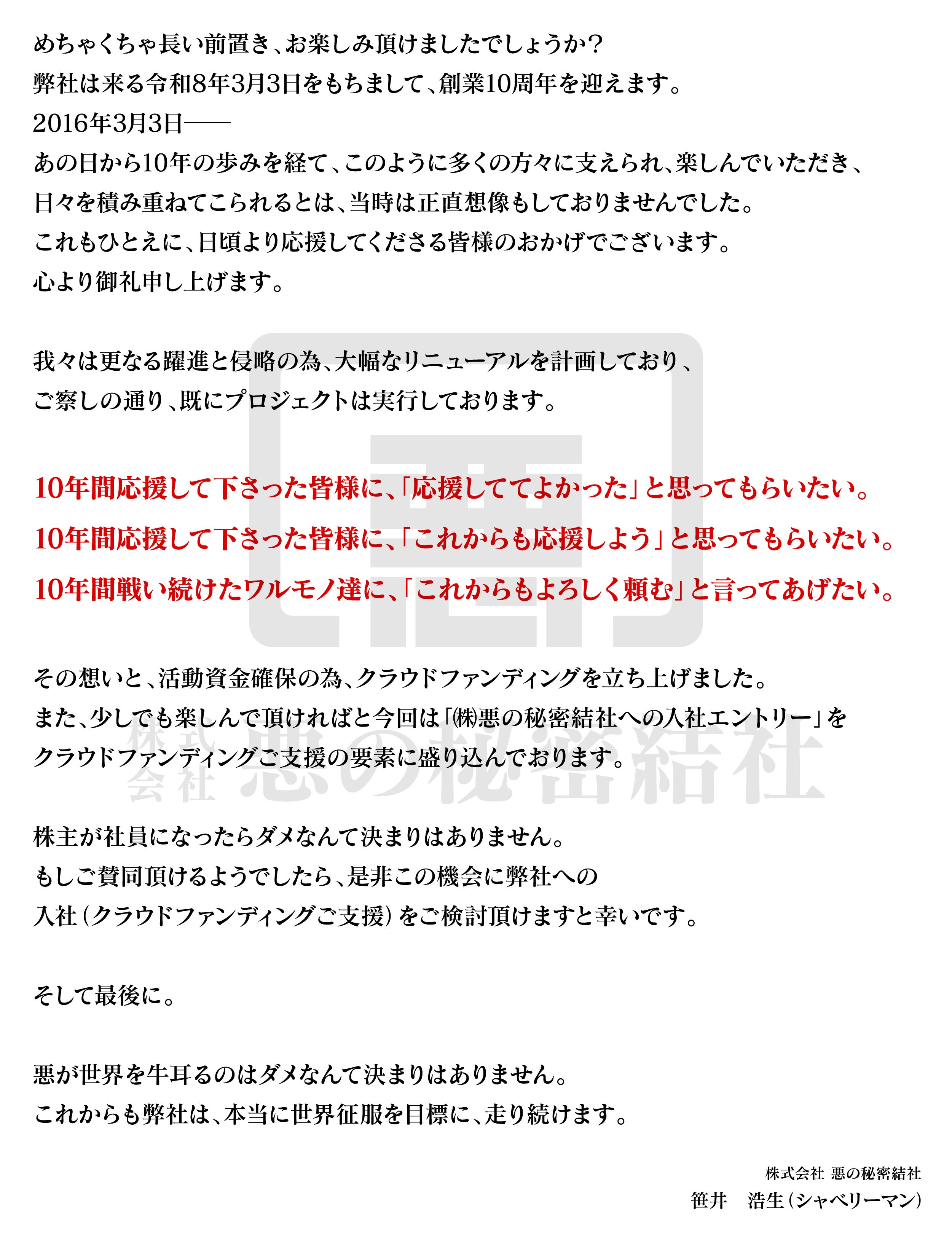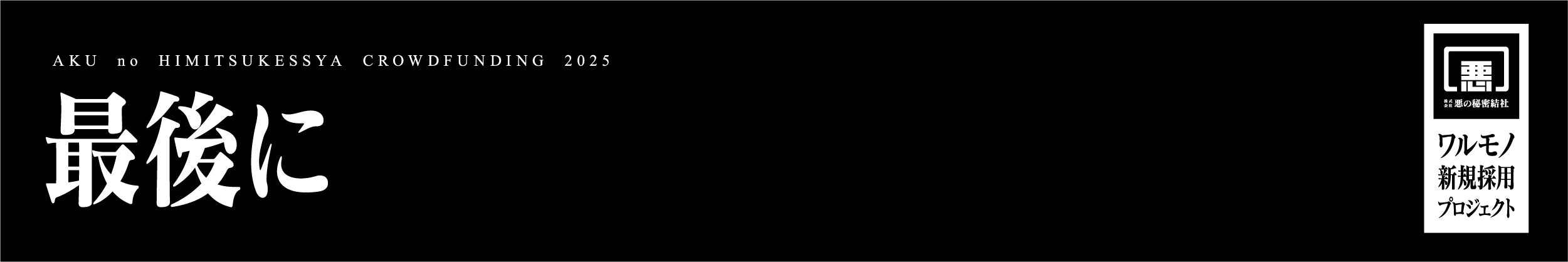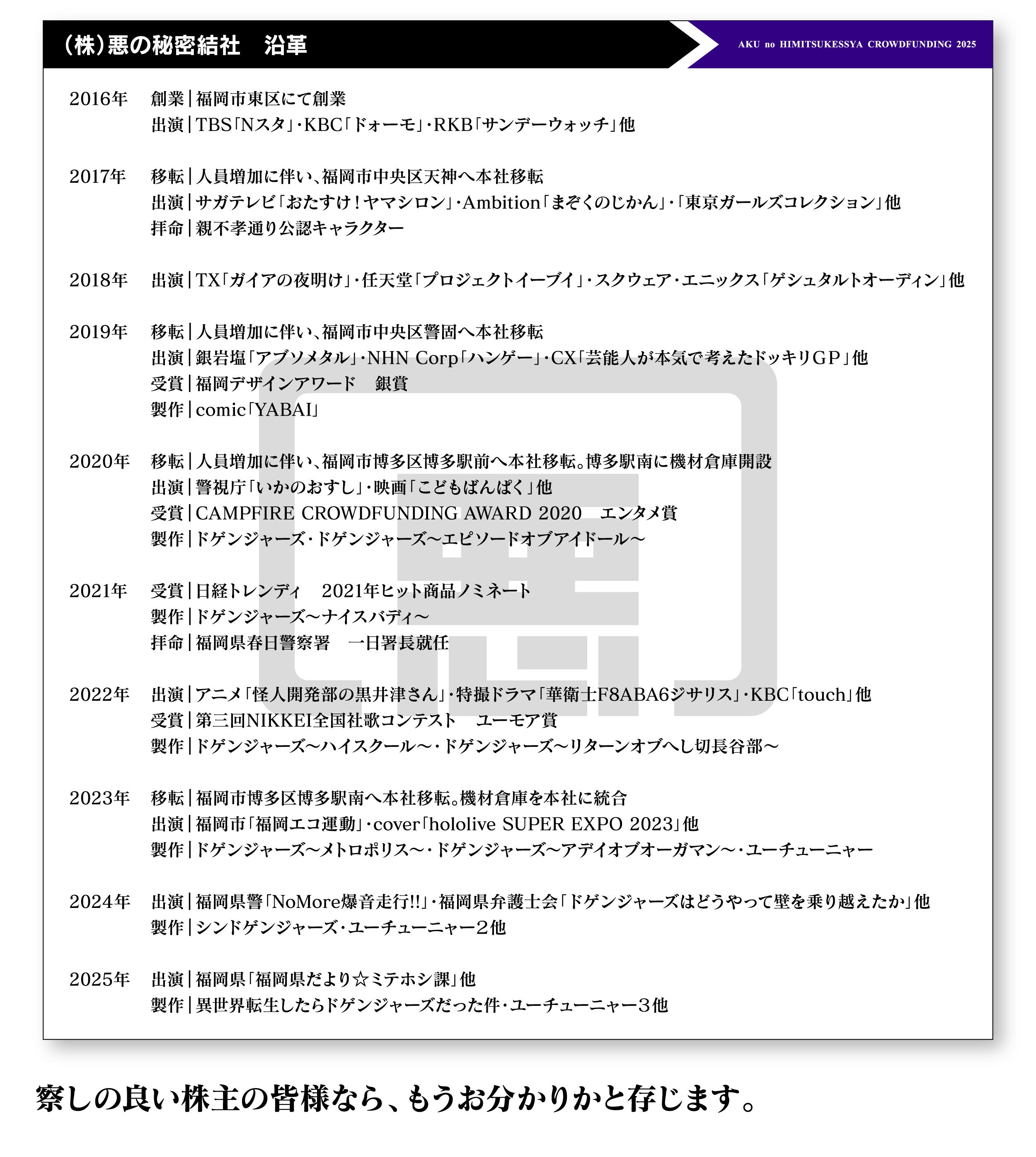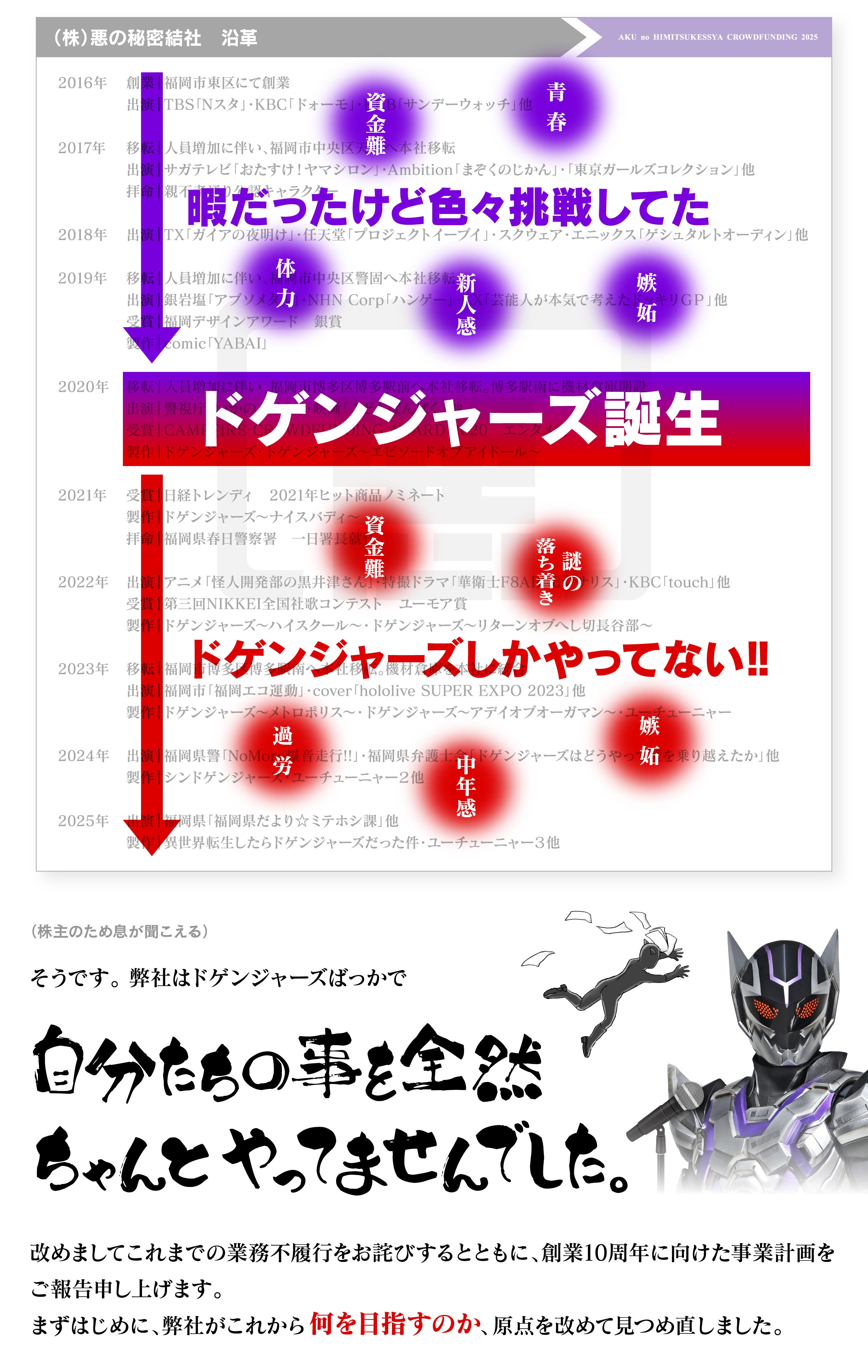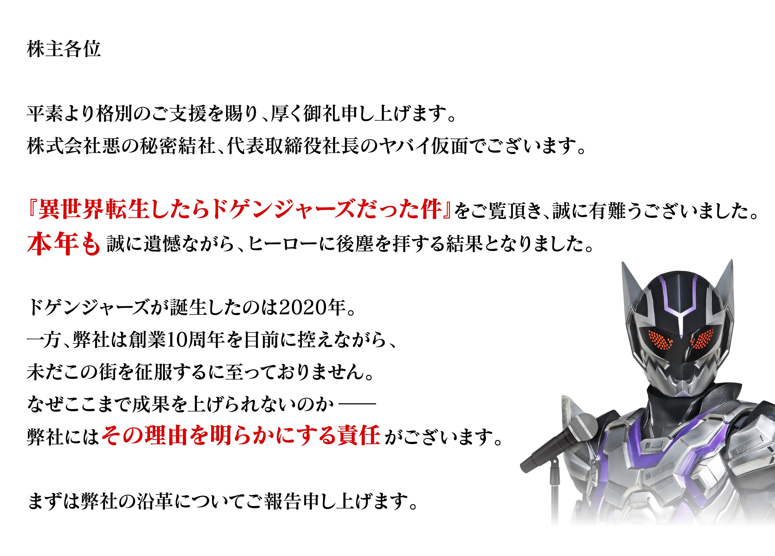 【株主優待コース】 大株主様~~~~~~~~~~!誠に…誠にありがとうございます! グッズはもちろん全てお渡しいたします。あとなんでも言うこと聞きます(弊社の可能な範囲で)。 土下座でも何でもします。 ※各イベントの開催日は、入社式4月18日(土)・新人懇親会4月19日(日)となります。 ※交通費・宿泊費等は、大変恐れ入りますがお客様にてご負担ください。 ※なんでもの範疇は是非お打ち合わせ出来ればと存じます。ある程度なんでもやります。 【新人懇親会イベントについて】 ※福岡市中洲周辺にて開催予定ではございますが、変更となる可能性もございます。 ※未成年のお客様のご応募は、誠に恐れ入りますがご遠慮させて頂きます。 【内容品】 ・海賊版「シン・ドゲンジャーズ」DVD ・「異世界転生したらドゲンジャーズだった件」丸ごと台本 ・転ドゲ スペシャルアクスタ ・会社案内(悪の秘密結社ワルモノ特写写真集) ・クリアファイル ・ネックストラップ ・付箋 ・ボールペン ・悪の秘密結社3事業部コンセプトアートアクリルスタンド ・ヤバイ仮面社長の御神体(ソフビ):標準仕様・特別仕様 ・推しキャラフォトブック ※備考欄へキャラクターの名称を1名ご指名ください。 ・なんでも言うこと聞く券 ・特製ご支援御礼ボイス(シャベリーマン) ・特製ご支援御礼ボイス(ヤバイ仮面) ◆リターン品「推しキャラフォトブック」について: ・ドゲンジャーズのキャラクターをご指定いただいても問題ございません。 ・今回の写真集はキャラクターごとに共通の内容となります。あらかじめご了承下さい。 <支援の御礼品> ・あつめやがれパチンジャーズ
