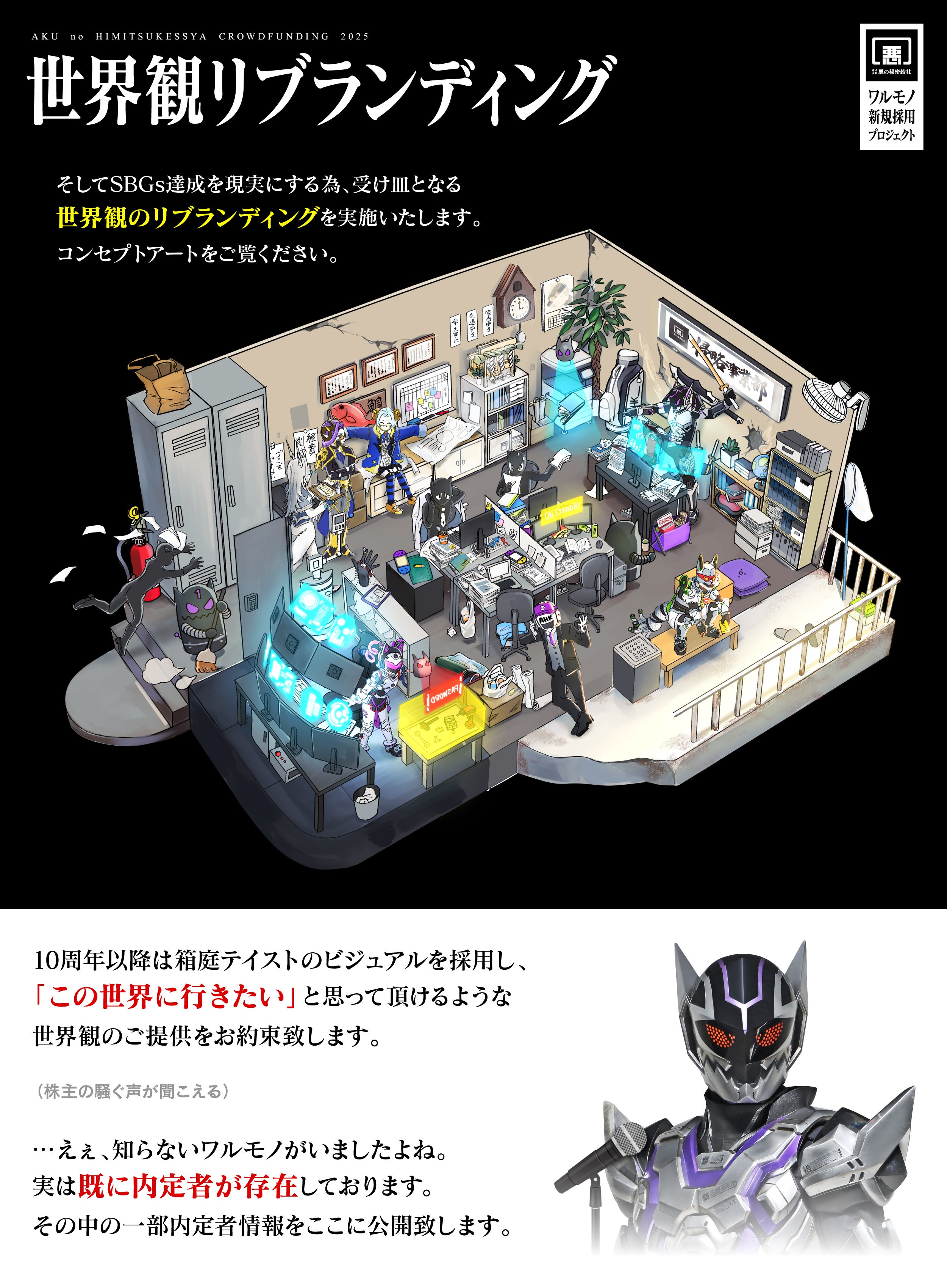 【2次選考コース】 1次選考コースの内容に加え、悪の秘密結社3事業部世界観アクリルスタンドと、ヤバイ仮面社長の“御神体”(ソフビ)をご用意いたしました。 社長を拝むのは昭和の普通です。 【内容品】 ・会社案内(悪の秘密結社ワルモノ特写写真集) ・クリアファイル ・ネックストラップ ・付箋 ・ボールペン ・悪の秘密結社3事業部コンセプトアートアクリルスタンド ・ヤバイ仮面社長の御神体(ソフビ) <支援の御礼品> ・あつめやがれパチンジャーズ