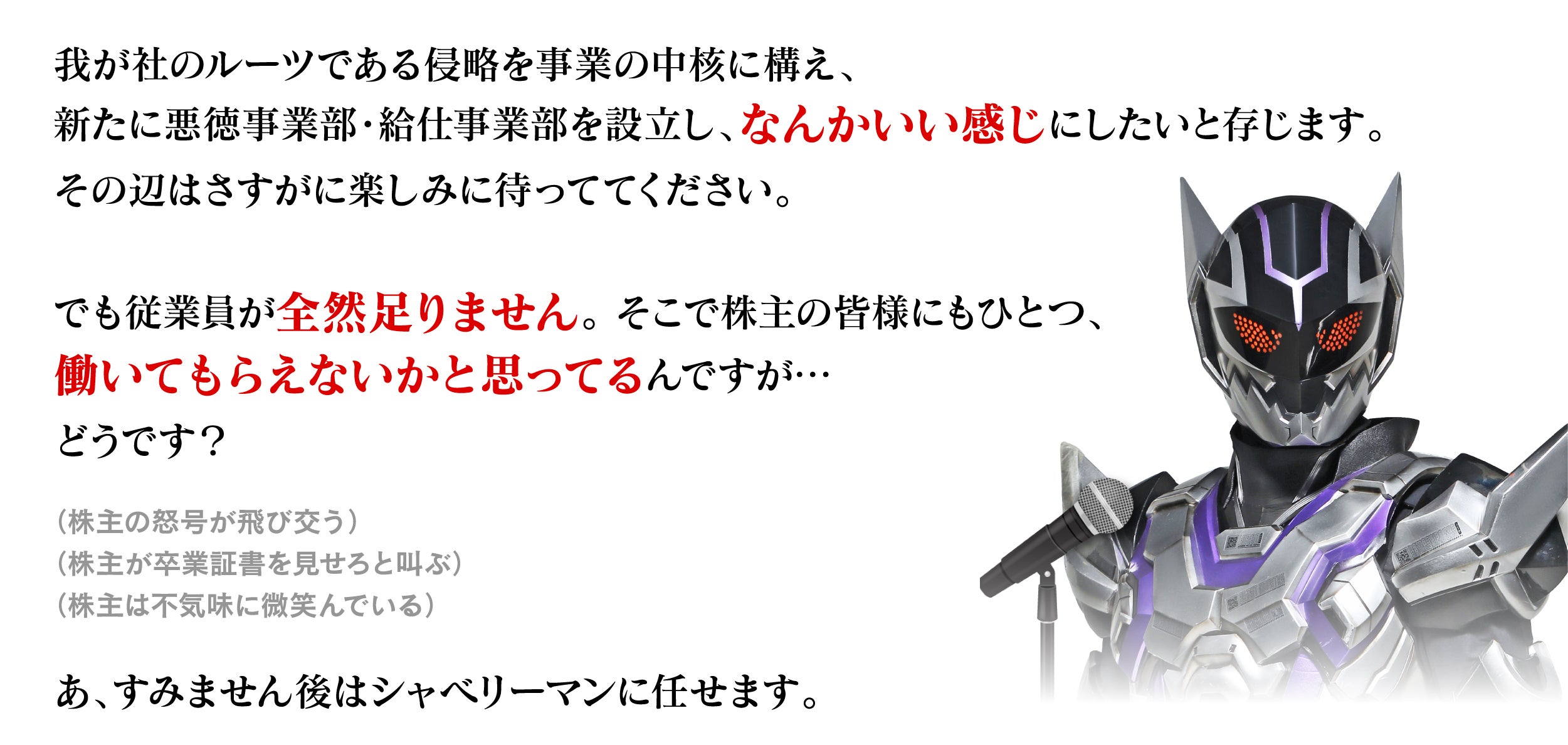 【ご好評につき増枠しました!株主優待コース】 大株主様~~~~~~~~~~!誠に…誠にありがとうございます! グッズはもちろん全てお渡しいたします。あとなんでも言うこと聞きます(弊社の可能な範囲で)。 土下座でも何でもします。 ※各イベントの開催日は、入社式4月18日(土)・新人懇親会4月19日(日)となります。 ※交通費・宿泊費等は、大変恐れ入りますがお客様にてご負担ください。 ※なんでもの範疇は是非お打ち合わせ出来ればと存じます。ある程度なんでもやります。 【新人懇親会イベントについて】 ※福岡市中洲周辺にて開催予定ではございますが、変更となる可能性もございます。 ※未成年のお客様のご応募は、誠に恐れ入りますがご遠慮させて頂きます。 【内容品】 ※リターン品の内容は、別途ございます【100万円「株主優待コース」】と同様となります。 ・海賊版「シン・ドゲンジャーズ」DVD ・「異世界転生したらドゲンジャーズだった件」丸ごと台本 ・転ドゲ スペシャルアクスタ ・会社案内(悪の秘密結社ワルモノ特写写真集) ・クリアファイル ・ネックストラップ ・付箋 ・ボールペン ・悪の秘密結社3事業部コンセプトアートアクリルスタンド ・ヤバイ仮面社長の御神体(ソフビ):標準仕様・特別仕様 ・推しキャラフォトブック ※備考欄へキャラクターの名称を1名ご指名ください。 ・なんでも言うこと聞く券 ・特製ご支援御礼ボイス(シャベリーマン) ・特製ご支援御礼ボイス(ヤバイ仮面) ◆リターン品「推しキャラフォトブック」について: ・ドゲンジャーズのキャラクターをご指定いただいても問題ございません。 ・今回の写真集はキャラクターごとに共通の内容となります。あらかじめご了承下さい。 <支援の御礼品> ・あつめやがれパチンジャーズ