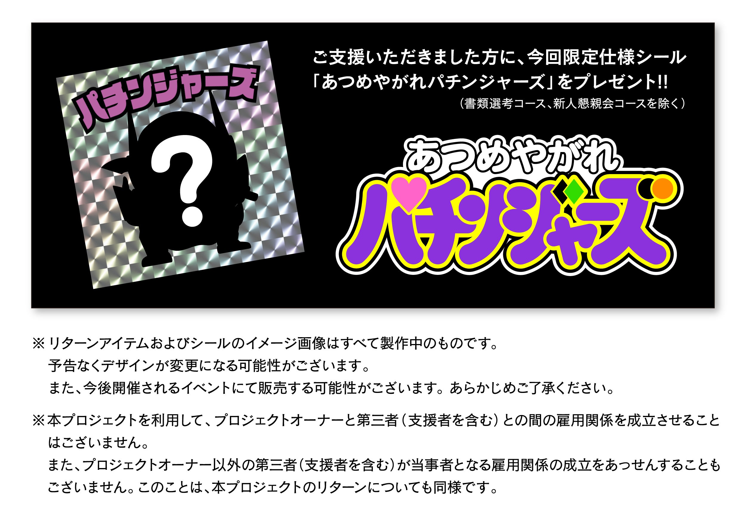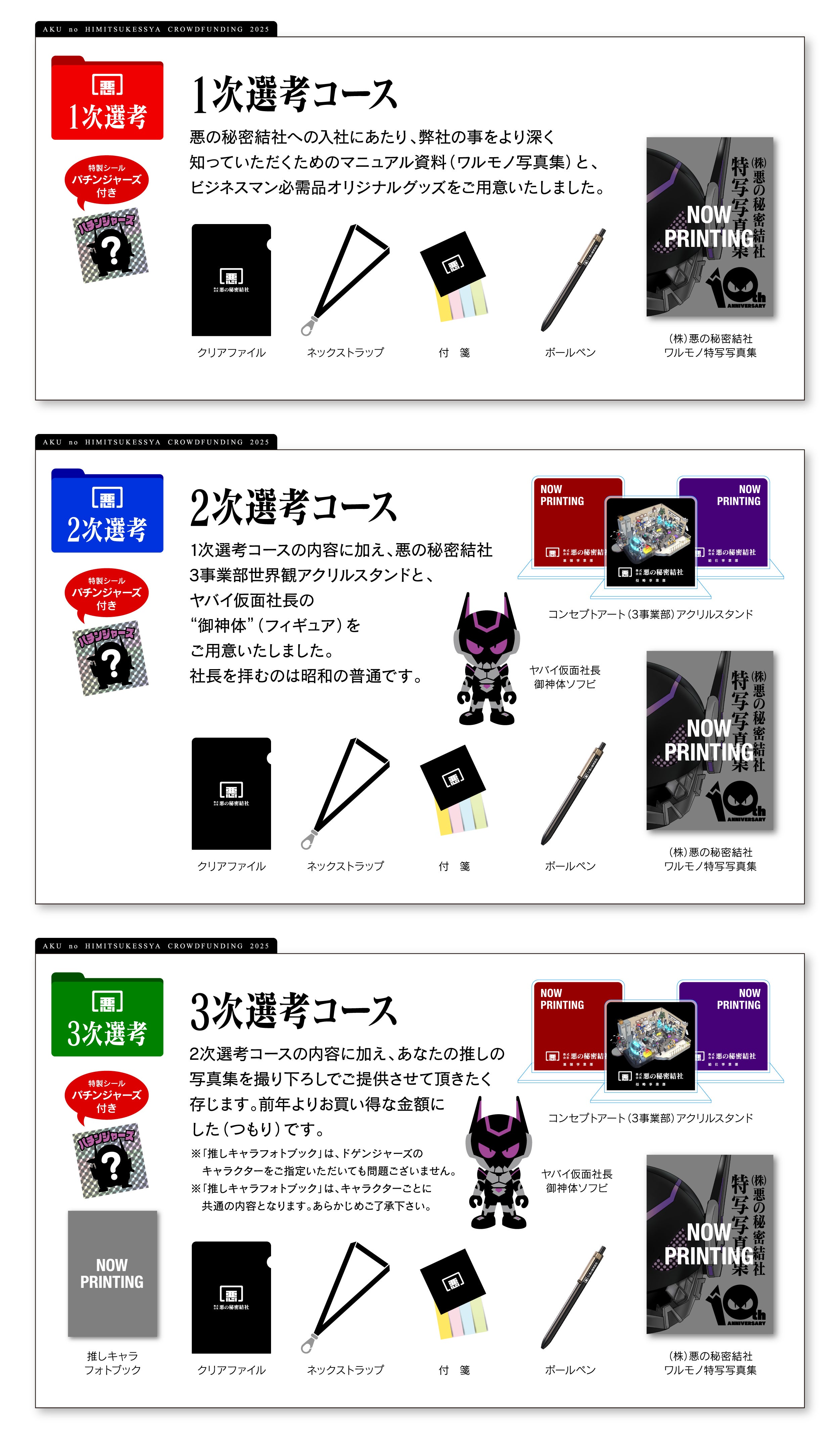 【1次選考コース】 悪の秘密結社への入社にあたり、当社の事をより深く知っていただくためのマニュアル資料(ワルモノ写真集)と、ビジネスマン必需品オリジナルグッズをご用意いたしました。 【内容品】 ・会社案内(悪の秘密結社ワルモノ特写写真集) ・クリアファイル ・ネックストラップ ・付箋 ・ボールペン <支援の御礼品> ・あつめやがれパチンジャーズ