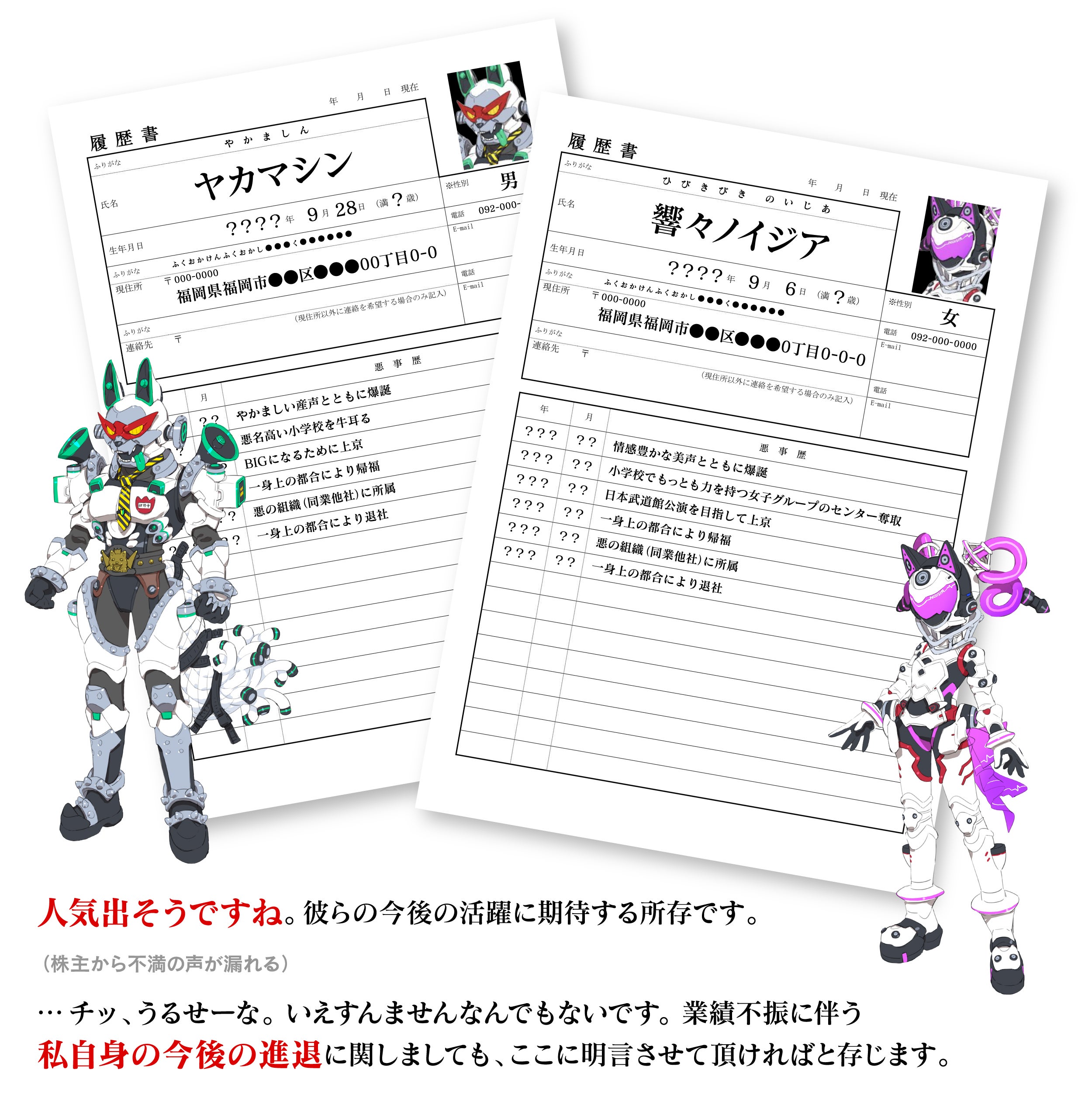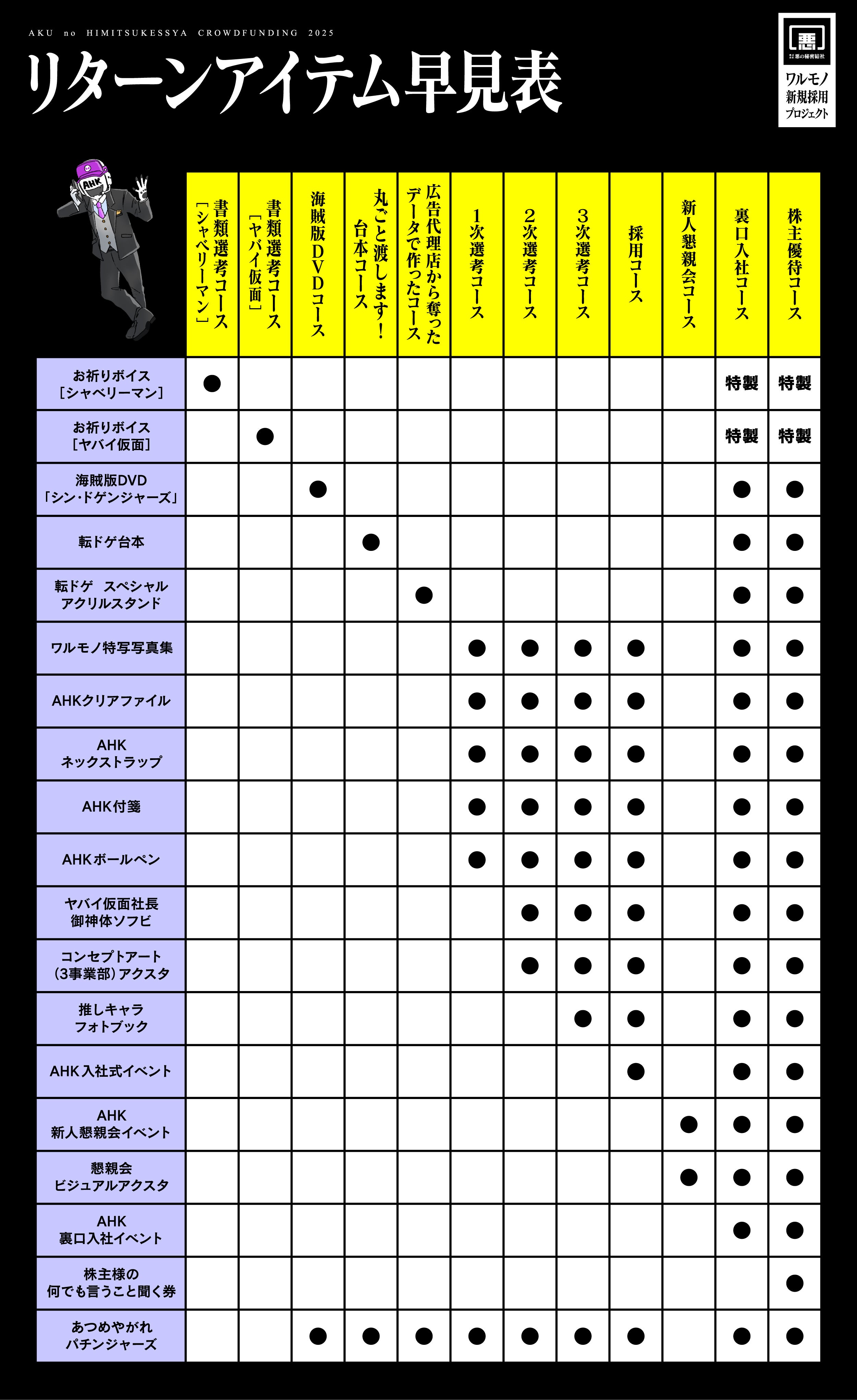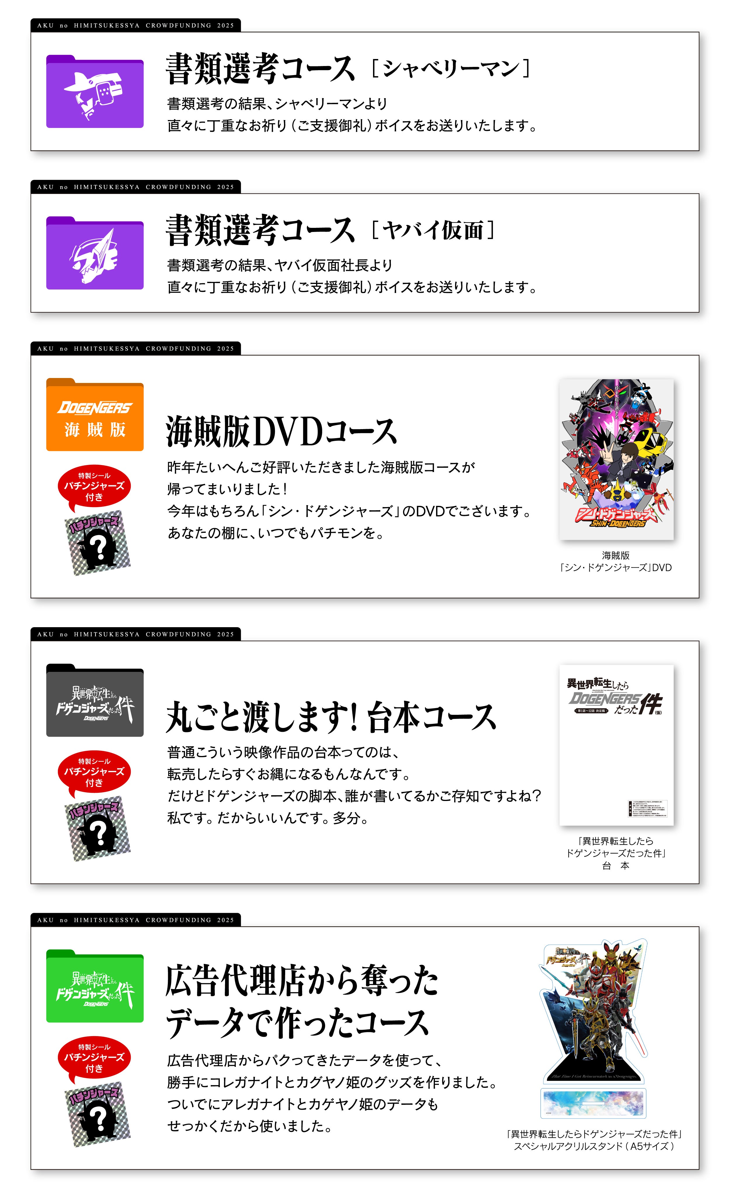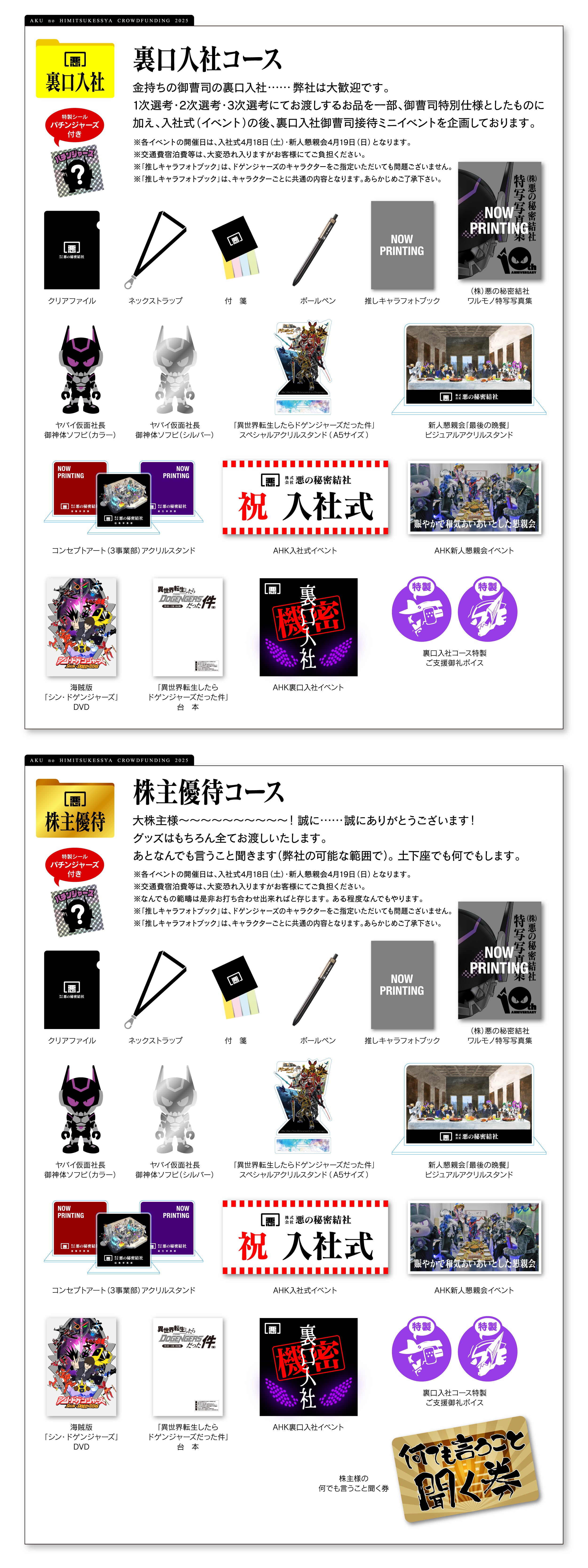 【裏口入社コース】 金持ちの御曹司の裏口入社…弊社は大歓迎です。 1次選考・2次選考・3次選考にてお渡しするお品を一部、御曹司特別仕様としたものに加え、入社式(イベント)の後、裏口入社御曹司接待ミニイベントを企画しております。 ※各イベントの開催日は、入社式4月18日(土)・新人懇親会4月19日(日)となります。 ※交通費・宿泊費等は、大変恐れ入りますがお客様にてご負担ください。 【新人懇親会イベントについて】 ※福岡市中洲周辺にて開催予定ではございますが、変更となる可能性もございます。 ※未成年のお客様のご応募は、誠に恐れ入りますがご遠慮させて頂きます。 【内容品】 ・海賊版「シン・ドゲンジャーズ」DVD ・「異世界転生したらドゲンジャーズだった件」丸ごと台本 ・転ドゲ スペシャルアクスタ ・会社案内(悪の秘密結社ワルモノ特写写真集) ・クリアファイル ・ネックストラップ ・付箋 ・ボールペン ・悪の秘密結社3事業部コンセプトアートアクリルスタンド ・新人懇親会「最後の晩餐」ビジュアルアクリルスタンド ・ヤバイ仮面社長の御神体(ソフビ):標準仕様・特別仕様 ・推しキャラフォトブック ※備考欄へキャラクターの名称を1名ご指名ください。 ・特製ご支援御礼ボイス(シャベリーマン) ・特製ご支援御礼ボイス(ヤバイ仮面) ◆リターン品「推しキャラフォトブック」について: ・ドゲンジャーズのキャラクターをご指定いただいても問題ございません。 ・今回の写真集はキャラクターごとに共通の内容となります。あらかじめご了承下さい。 <支援の御礼品> ・あつめやがれパチンジャーズ