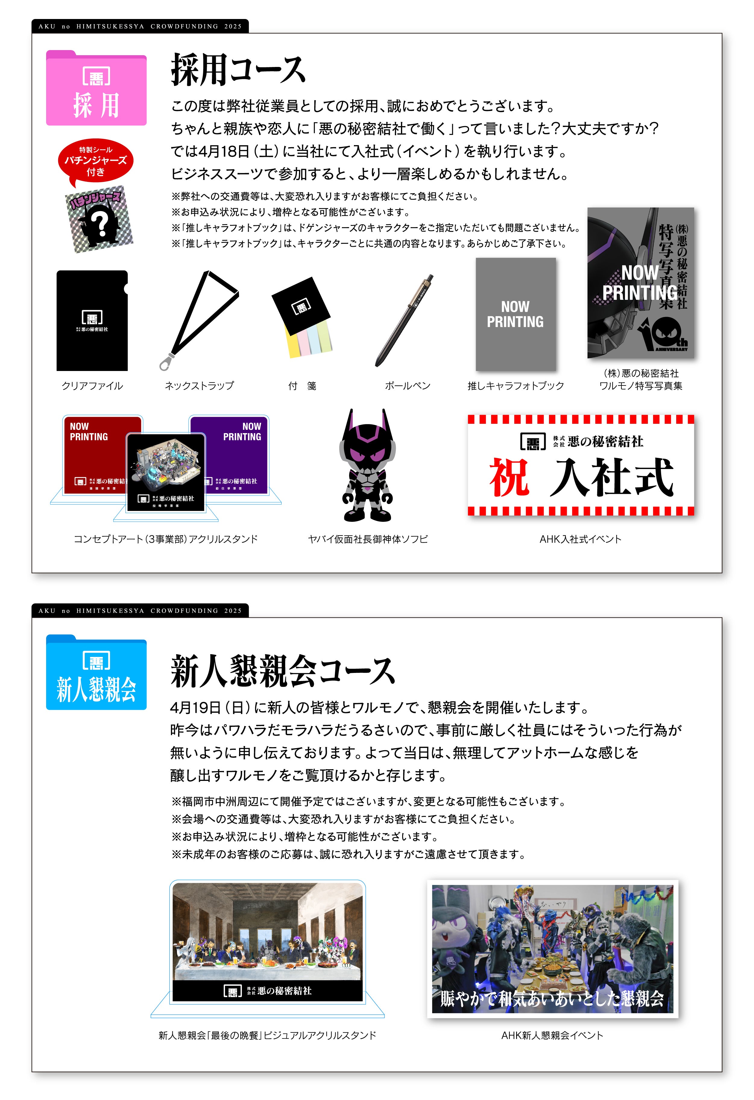 【採用コース】 この度は弊社従業員としての採用、誠におめでとうございます。 ちゃんと親族や恋人に「悪の秘密結社で働く」って言いました?大丈夫ですか?では4月18日(土)に当社にて入社式(イベント)を執り行います。ビジネススーツで参加すると、より一層楽しめるかもしれません。 【内容品】 ・会社案内(悪の秘密結社ワルモノ特写写真集) ・クリアファイル ・ネックストラップ ・付箋 ・ボールペン ・悪の秘密結社3事業部コンセプトアートアクリルスタンド ・ヤバイ仮面社長の御神体(ソフビ) ・推しキャラフォトブック ※備考欄へキャラクターの名称を1名ご指名ください。 ◆リターン品「推しキャラフォトブック」について: ・ドゲンジャーズのキャラクターをご指定いただいても問題ございません。 ・今回の写真集はキャラクターごとに共通の内容となります。あらかじめご了承下さい。 【入社式イベントの諸注意】 ※弊社への交通費等は、大変恐れ入りますがお客様にてご負担ください。 ※お申込み状況により、増枠となる可能性がございます。 <支援の御礼品> ・あつめやがれパチンジャーズ