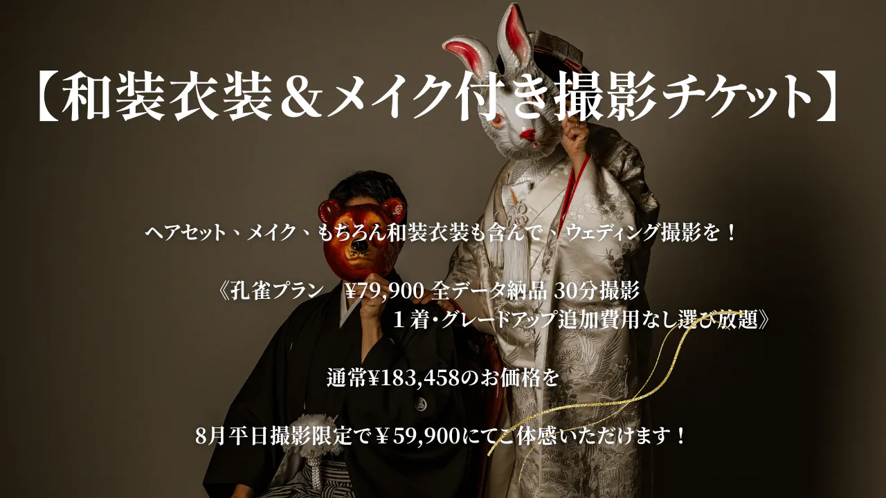 こんにちは!24toWeddingのRuuです!クラウドファンディングをご支援、応援いただきありがとうございます。昨日Instagramで質問を募集したところ、「和装は無いんかーー???!!」とのお声を多数頂戴しましたので、早速限定3枠とはなりますが和装撮影ができるリターンをご用意しました!まだ新スタジオで和装撮影プランの詳細は決まっていないので現行の24towedding和装セクションtokoshieでのプランを参考にリターンを考えました。新しいスタジオは2面和装用にデザインしたのですが、洋装用の面でも和モダンになって可愛いと思うので今回はどの面でも撮影できるようにしようと思います!また、せっかくご支援くださるのですから衣装もどれを選んでもプラン内でいけるようにしました!≪内容≫ ・撮影時間30分・ご新婦様ヘアメイク・ご新郎様ご新婦様着付け ・ご新郎様ご新婦様1着※グレードアップ料金なし ・全データ加工納品 ・セット選び放題 一番グレードの高い衣装をお選びいただいた場合通常¥183,458のお価格を 8月平日撮影限定で¥59,900にてご体感いただけます! さすがにこのご料金形態では赤字なので限定3組様とさせてください( ;∀;)私共は、本場京都より伝統を大事にした振付技術を伝承うけており、とりあえず和装を撮ろうではなく、クオリティと伝統を重視しております。一生に一度のウェディングで一度は諦めた和装ウェディング写真をぜひこの機会に。