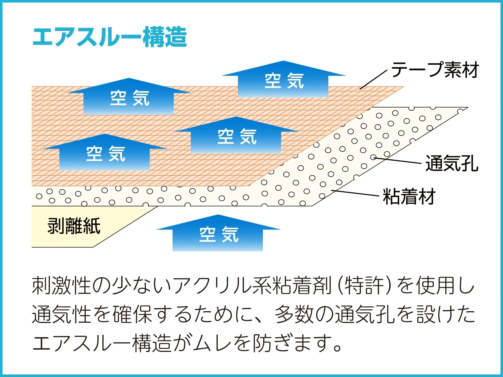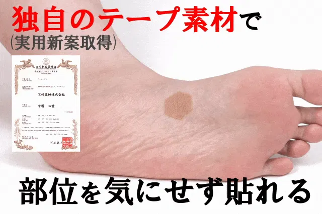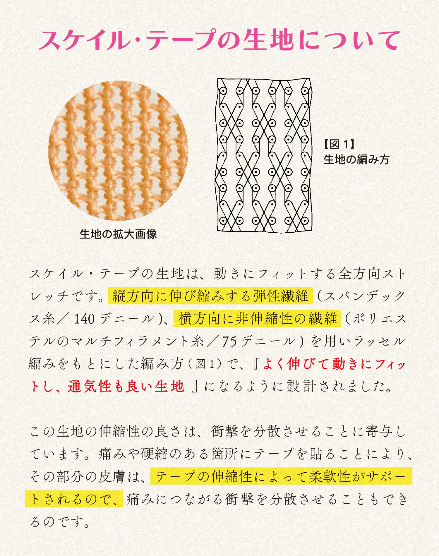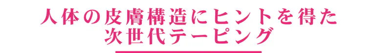 テープの素材には、非伸縮性繊維と弾性繊維を組み合わせた特殊なラッセル編み構造(実用新案取得)を採用しました。これにより、正常な皮膚の構造と柔軟性に近い全方向ストレッチを実現。