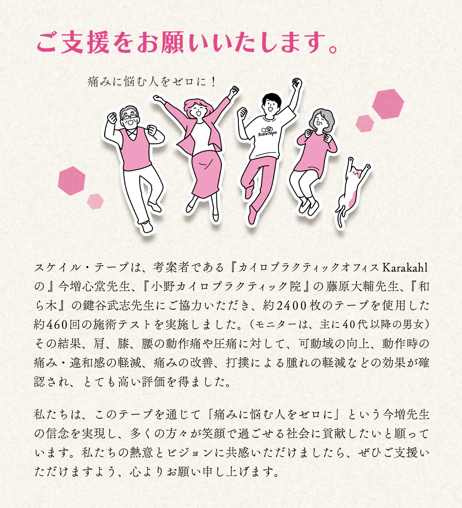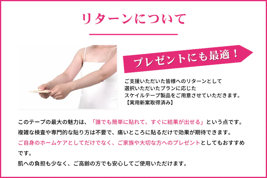 2025/10/15 16:39「【スケイルテープ】正常な皮膚構造に着目した、貼るだけで痛みケアができるテーピング」プロジェクトオーナーの江崎器械株式会社です。この度は、弊社の挑戦にご賛同いただき、また長期間にわたり温かいご支援とご期待をお寄せいただき、誠にありがとうございました。リターン品の発送についてのご報告大変お待たせいたしました。 ご支援いただきましたリターン品「スケイルテープ」の発送を、本日より開始いたしましたことをご報告申し上げます。皆さまの多大な応援のおかげで、無事に製品の生産を終え、いよいよお届けできることを開発チーム一同、心より喜んでおります。お届けまでの流れご支援者様へは、順次お荷物が到着いたします。発送完了後、ご支援者様お一人おひとりへ、追跡番号などの詳細を記載した個別の発送完了メールを別途お送りしておりますので、そちらにてご確認をお願いいたします。お手数をおかけいたしますが、到着まで今しばらくお待ちいただけますようお願い申し上げます。最後に私たちは、スケイルテープが皆さまの日常の「痛みケア」の一助となることを願っております。商品に関するご質問や、ご不明点がございましたら、お気軽にお問い合わせくださいませ。改めて、この度のプロジェクトへの多大なご支援、誠にありがとうございました。今後とも、江崎器械株式会社をよろしくお願い申し上げます。プロジェクトオーナー 江崎器械株式会社 もっと見る【スケイルテープ】クラウドファンディングにご支援いただきありがとうございました!