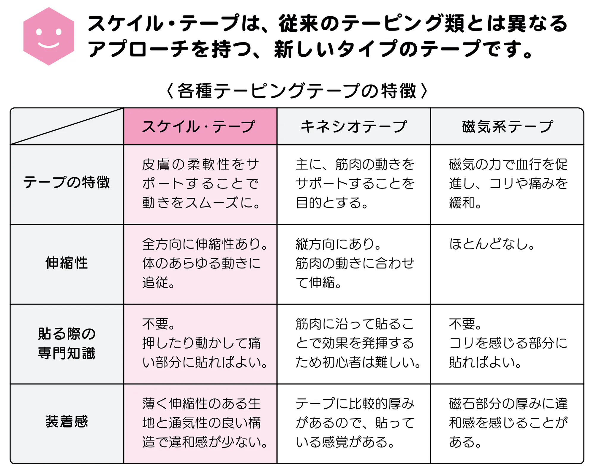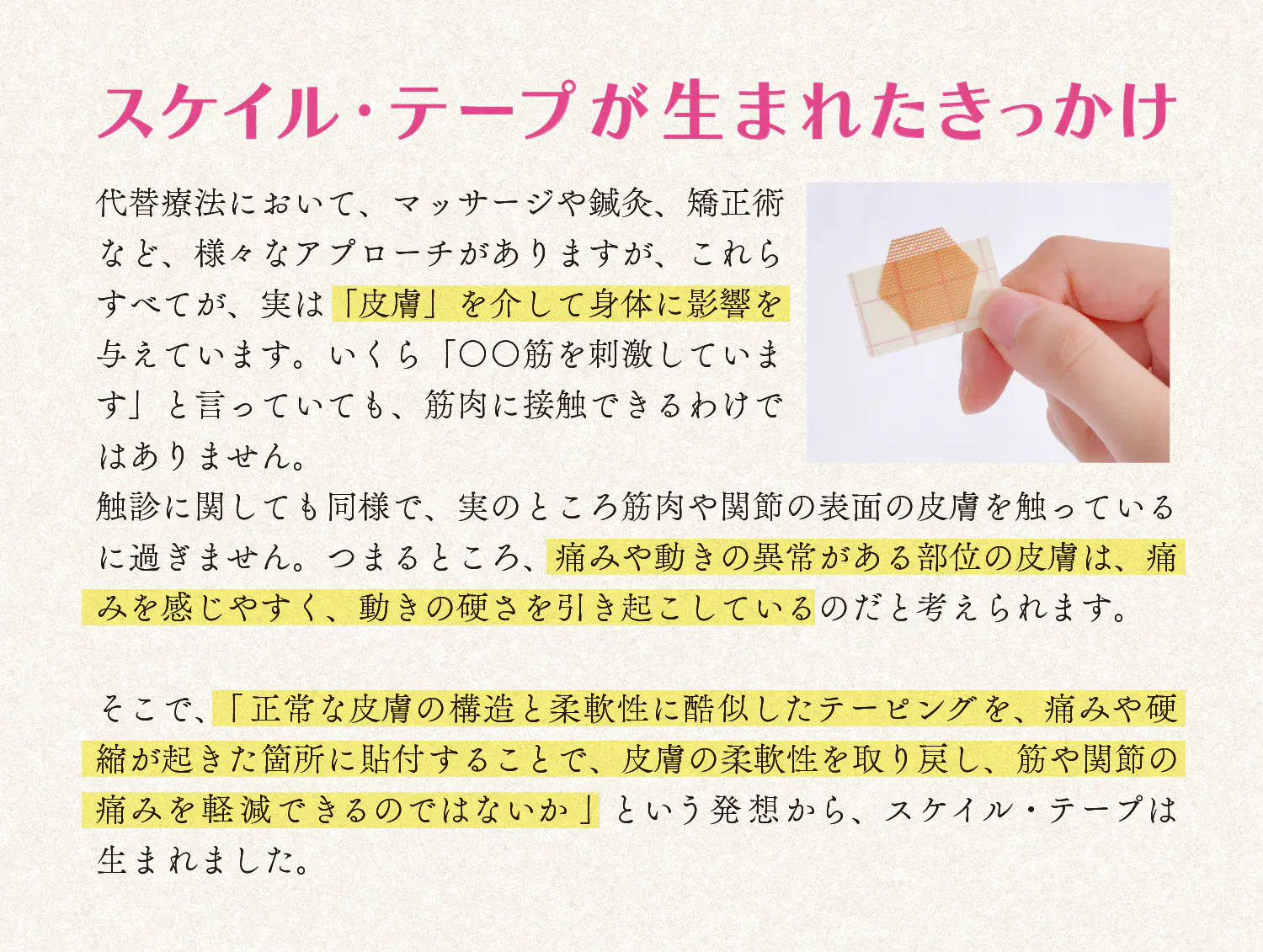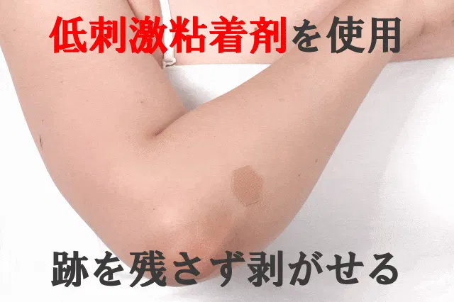 従来のテープのように、ケアする部位や筋肉の走行を気にする必要がなく、どこにでも貼るだけで、肌にやさしくフィットします。