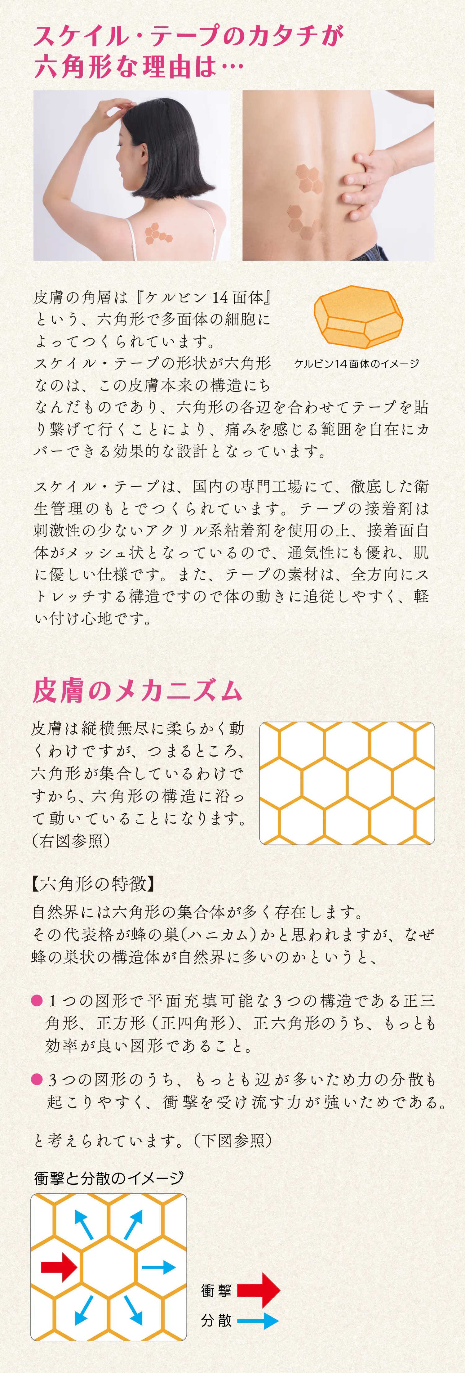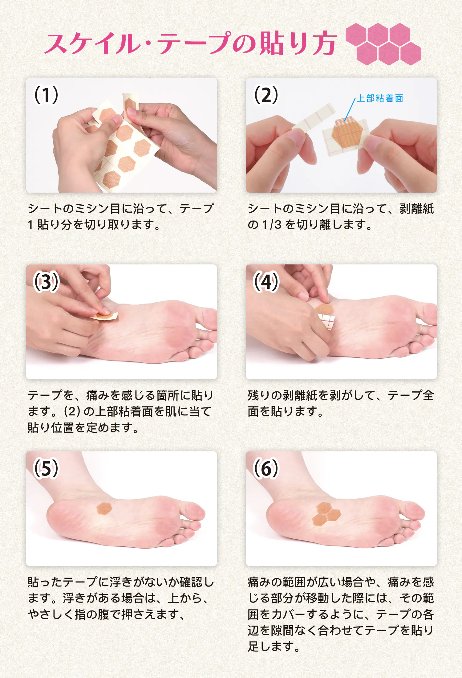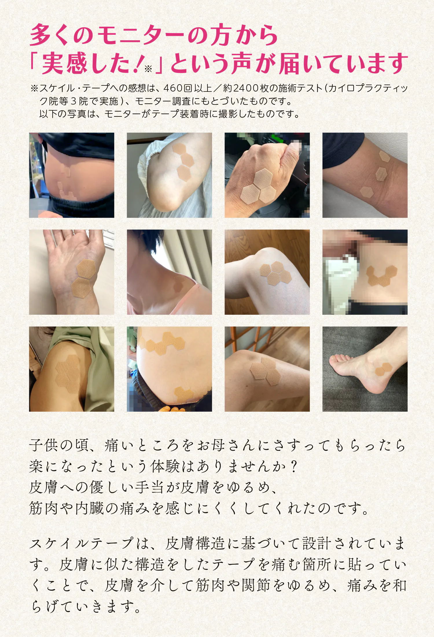 従来のテープのように、ケアする部位や筋肉の走行を気にする必要がなく、どこにでも貼るだけで、肌にやさしくフィットします。