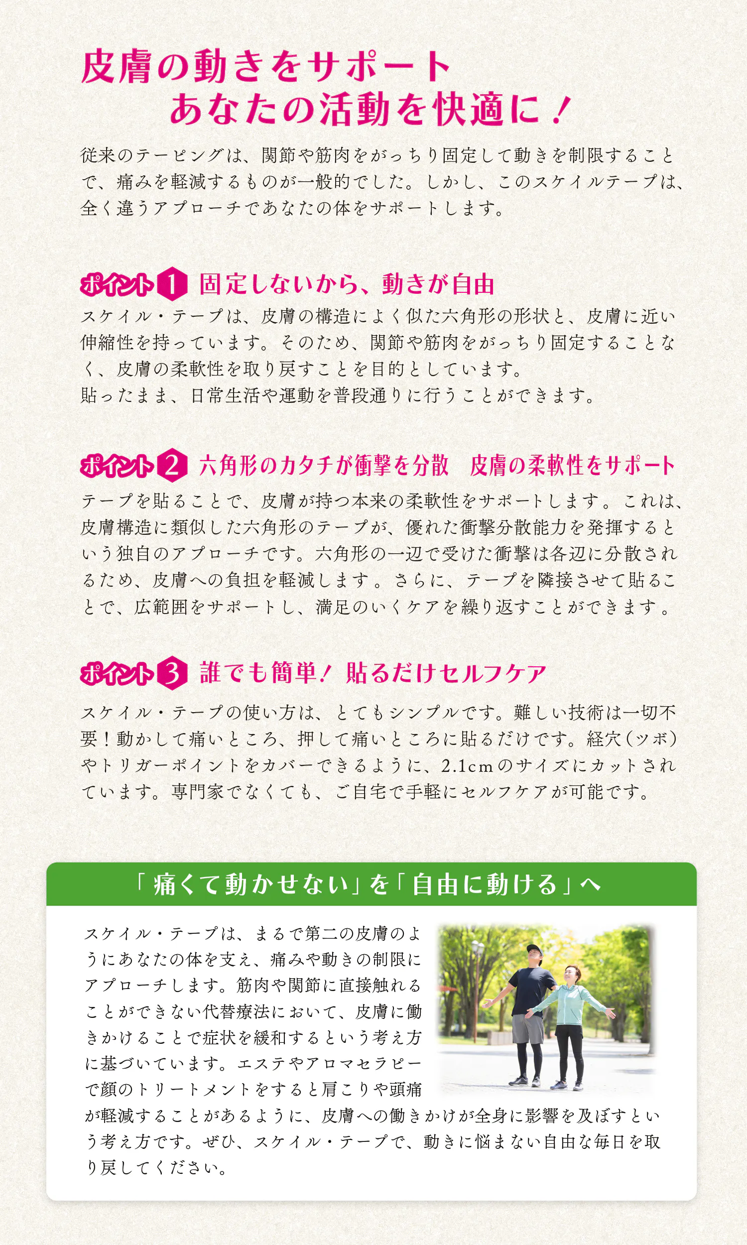 痛みや拘縮を感じるところに貼ることで、皮膚本来の柔軟性をサポートします。