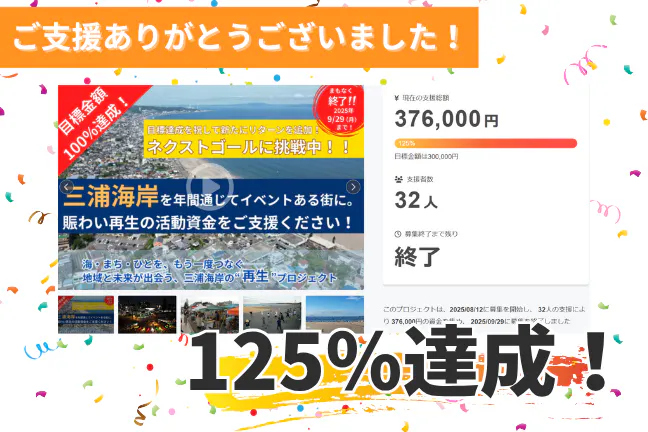 2025/09/30 15:22【ご報告】このたびは三浦海岸バルウォークプロジェクトにご支援いただき、心よりお礼申し上げます。おかげさまで、目標支援金額を125%達成することができました。ネクストゴールとして設定した支援人数30人以上も達成でき、本当にうれしく思っております。集まった支援金は予定どおり、三浦海岸の復興活動に活用させていただきます。皆さまのお力添えにより、これからも三浦海岸のために持続可能な地域の未来づくりを継続して行けそうです。リターン発送につきましても準備が整い次第、改めてご連絡いたしますので少々お待ちください。まずは取り急ぎ、クラウドファンディング終了のご報告と御礼までお知らせいたします。三浦海岸バルウォーク委員会より もっと見る