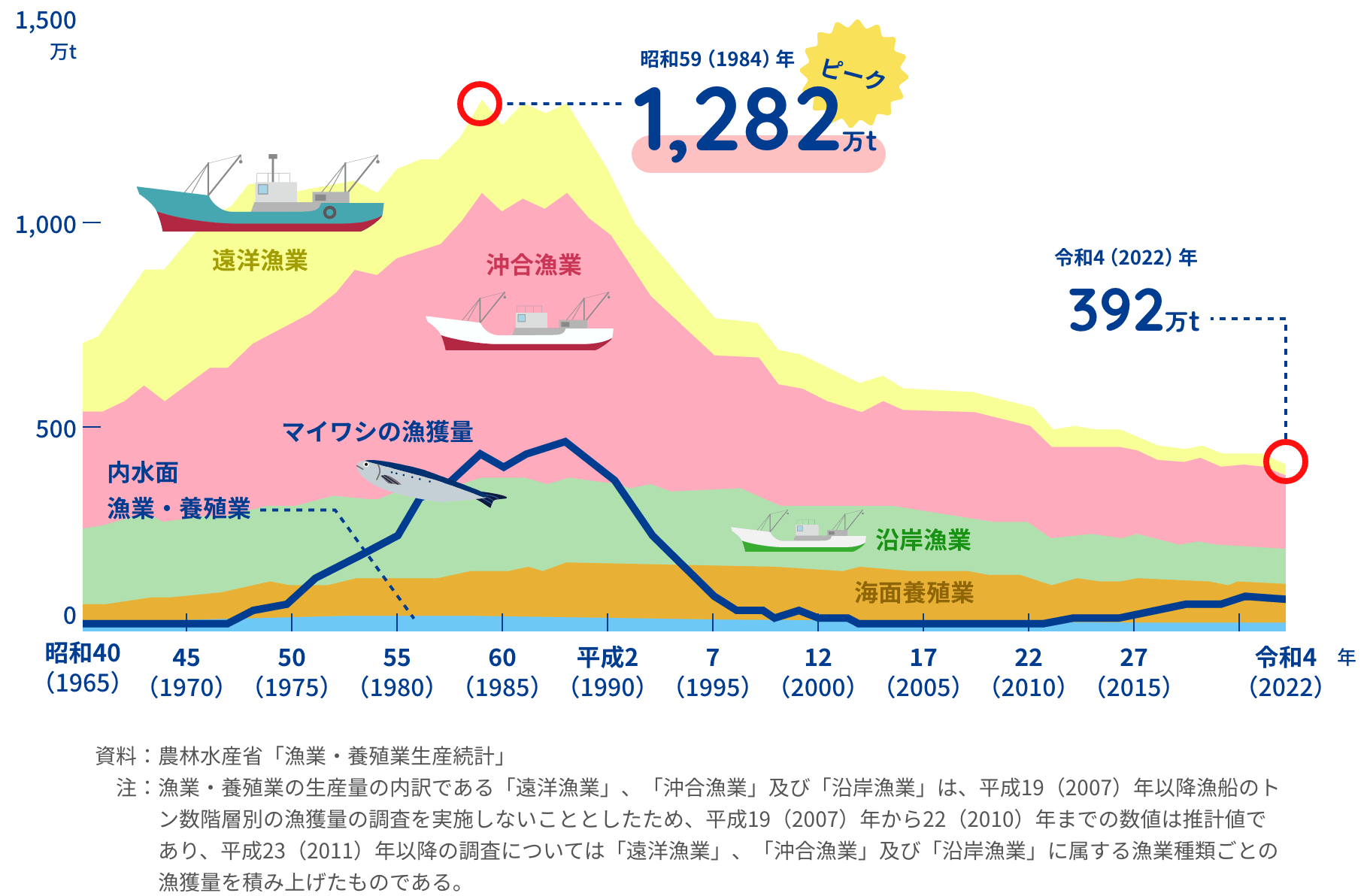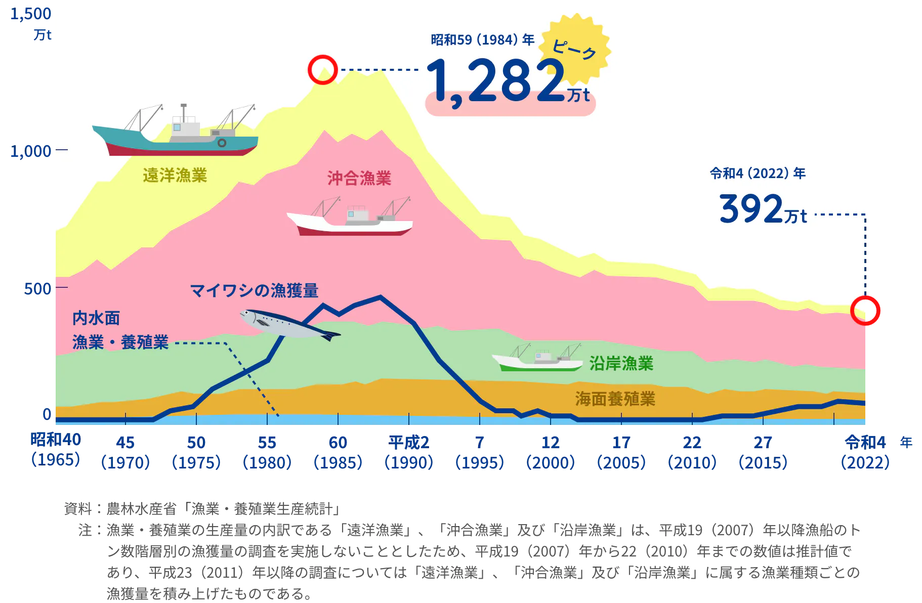 日本の漁獲量は1984年から減少傾向にあり、2022年にはピーク時の3分の1にまで減少しています。