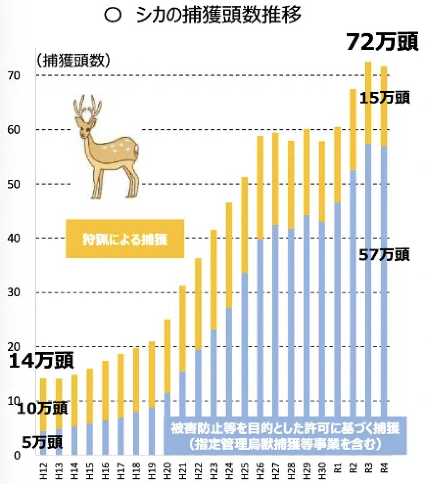 そのため生態系の保全を目的として、日本では年間数十万頭のシカを頭数管理が必要不可欠で狩猟、駆除(令和3年度捕獲数は72万頭以上)していますが駆除されたシカの有効活用率は約10〜20%(令和5年)80から90%近くが廃棄され、廃棄するための莫大な処理料金に税金が投入されてます。