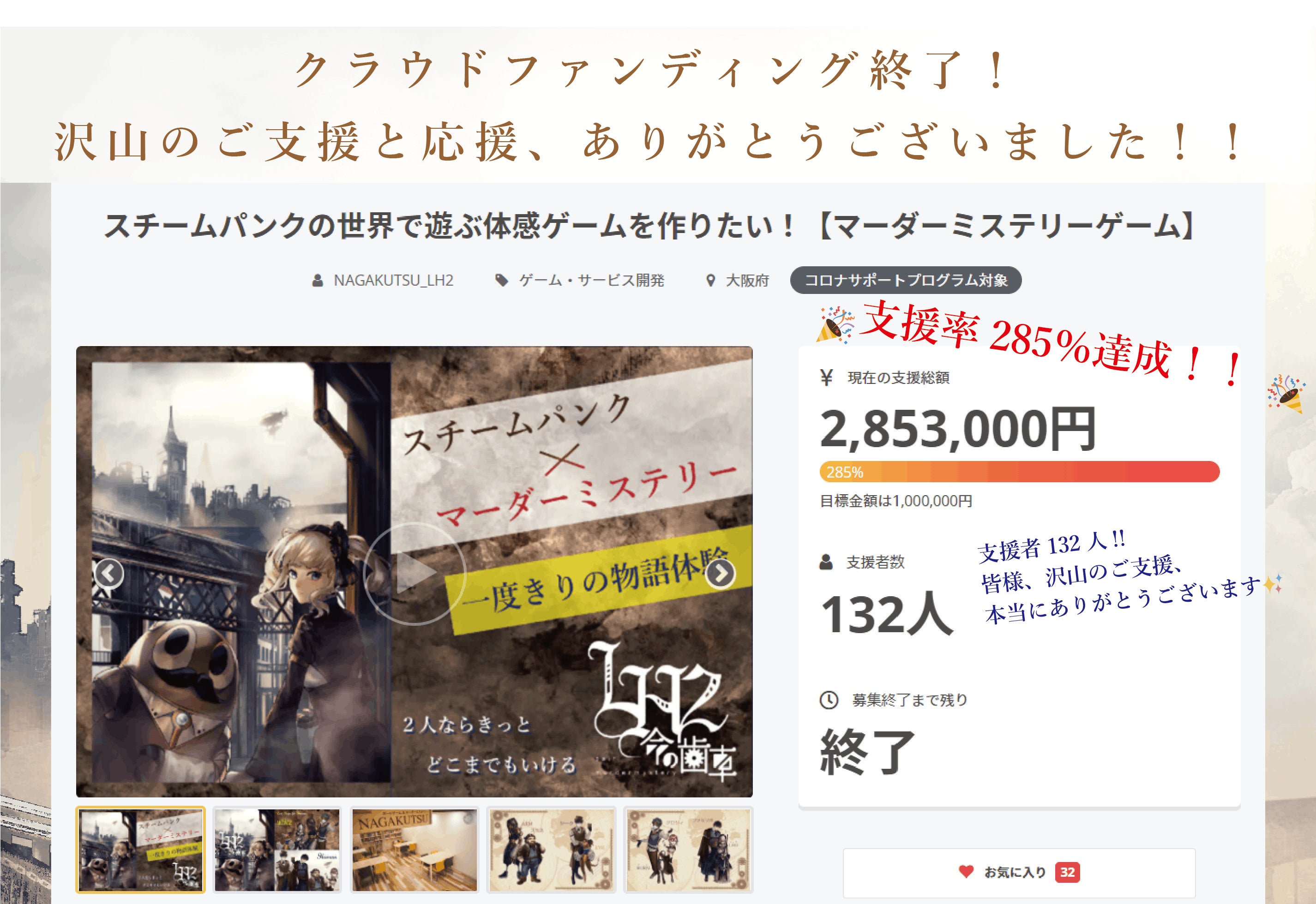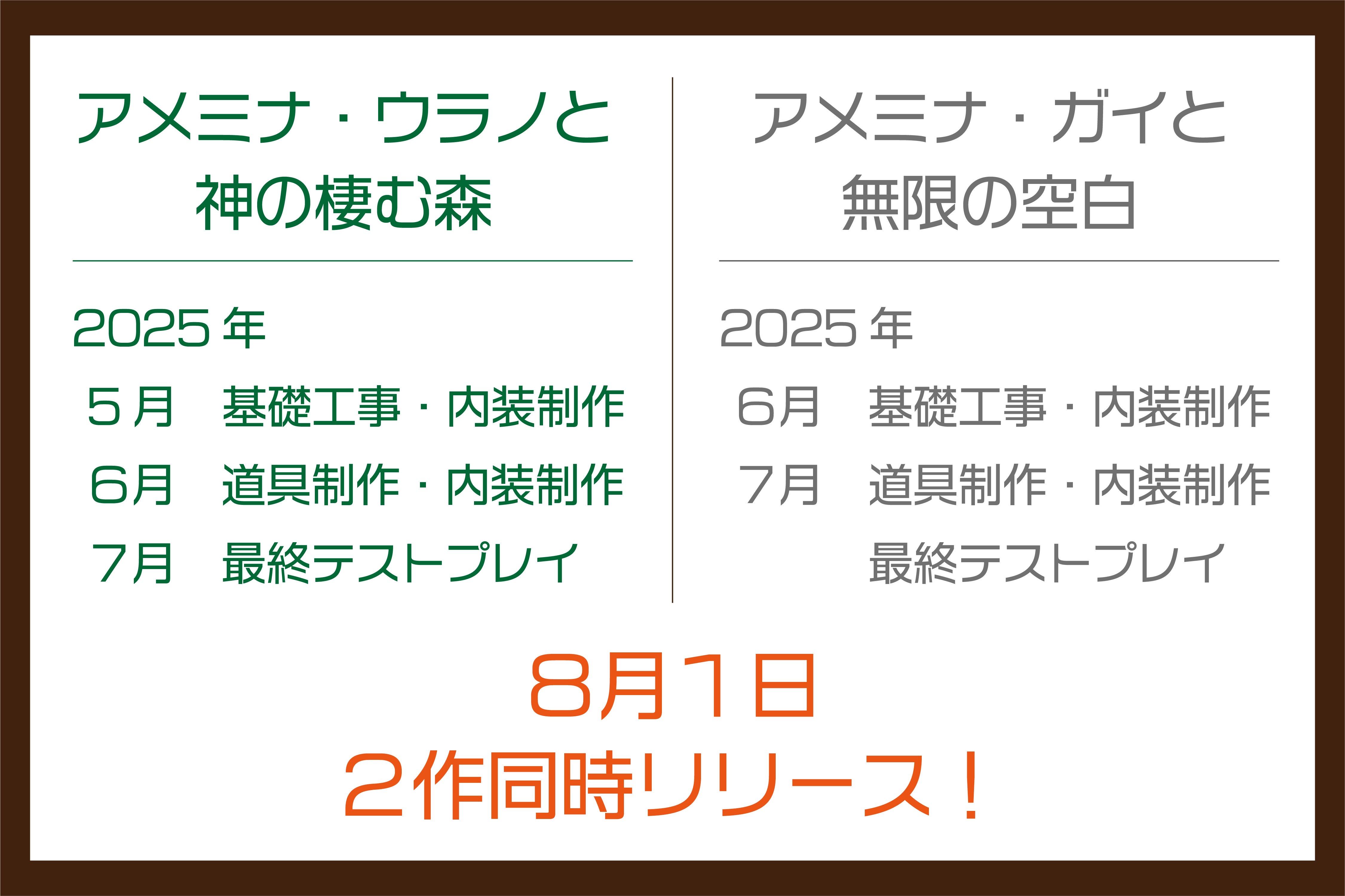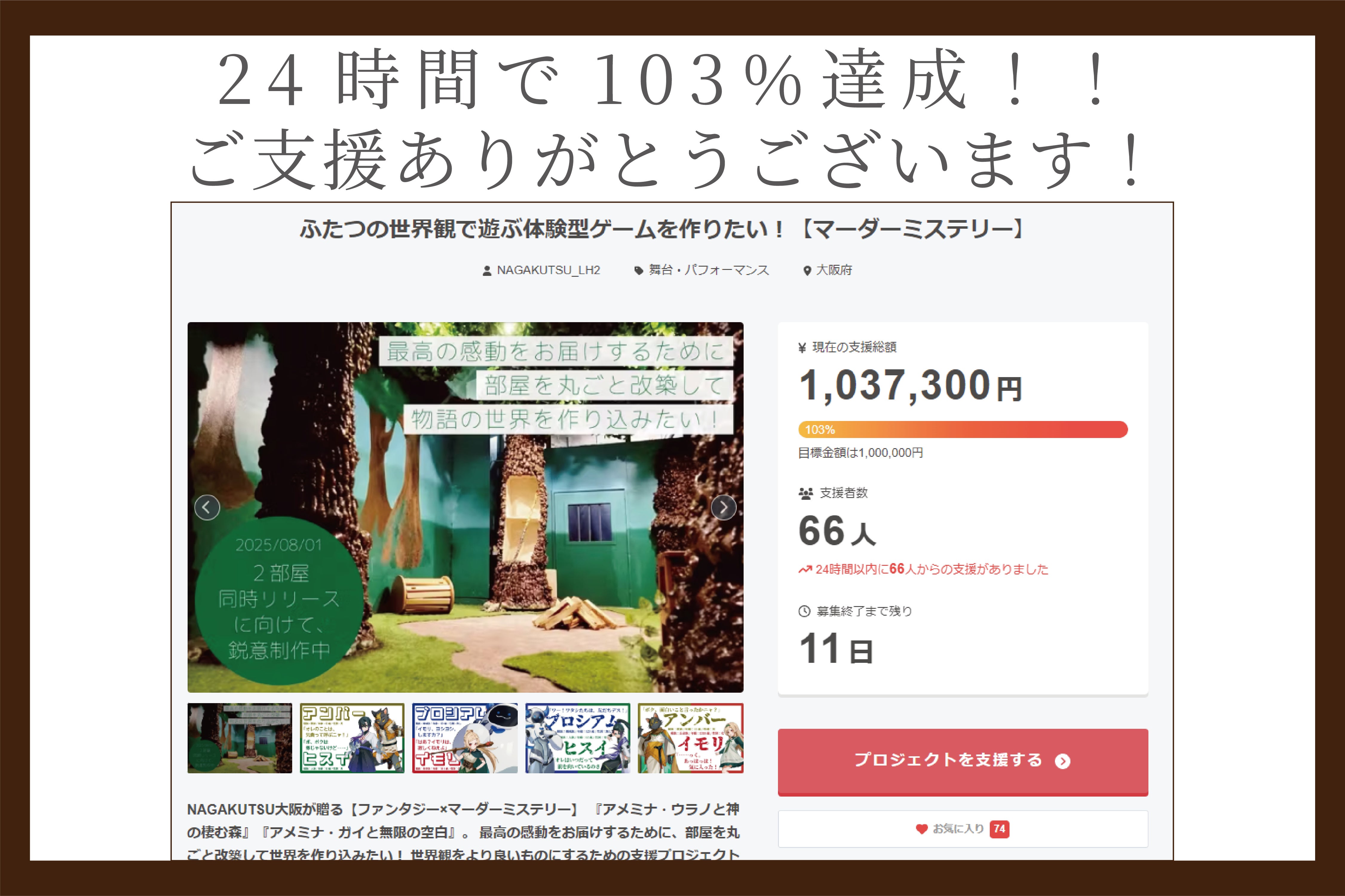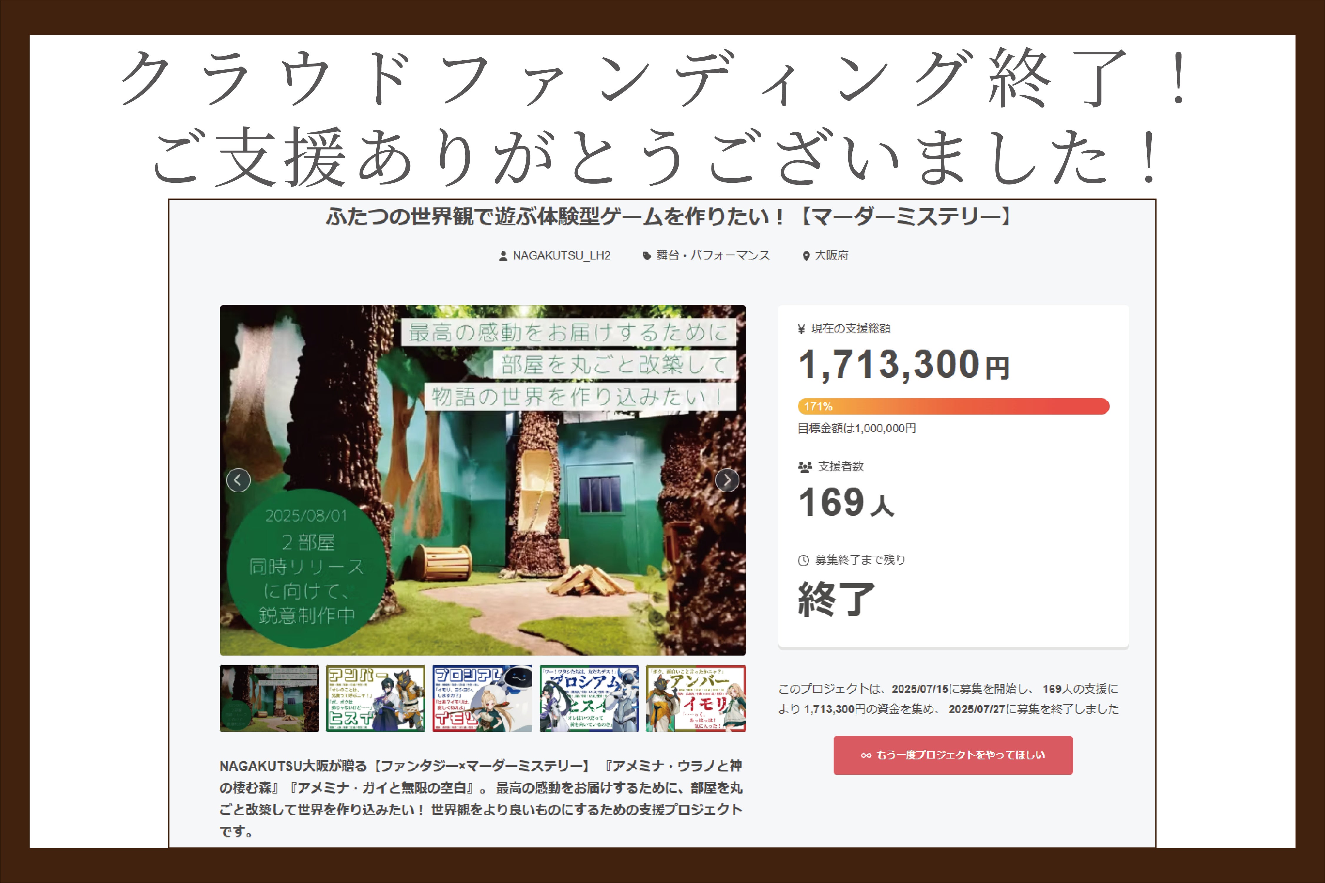 2025/07/29 23:05クラウドファンディング終了!ご支援ありがとうございました!171%達成しました!!皆様、本当に、たくさんのご支援ありがとうございました!公演開始まで残り3日間。昨日、先行体験会・GM練習公演を行い、着々と完成に近づいています!GMも既に数名ずつテストに合格しており、月末には発表される予定です。あとは、細かい誤字修正などが終われば完成!!リターン品についても、これから順次、作成していきますが、「物語の世界に名前を刻む」は、公演開始日当日より確認することが出来ます!公演チケットも発売しておりますので、ぜひ皆様遊びに来てください。チケット購入はこちら⇩『アメミナ・ウラノと神の棲む森』『アメミナ・ガイと無限の空白』詳細はこちら⇩公式HP改めて、この度は、たくさんのご支援を頂き、本当にありがとうございました!皆様の協力があってこその作品となりました。次は、神の棲む森・無限の空白で、皆様とお会いできることを楽しみにしております。 もっと見る【第5回活動報告】アメ白、部屋公開!