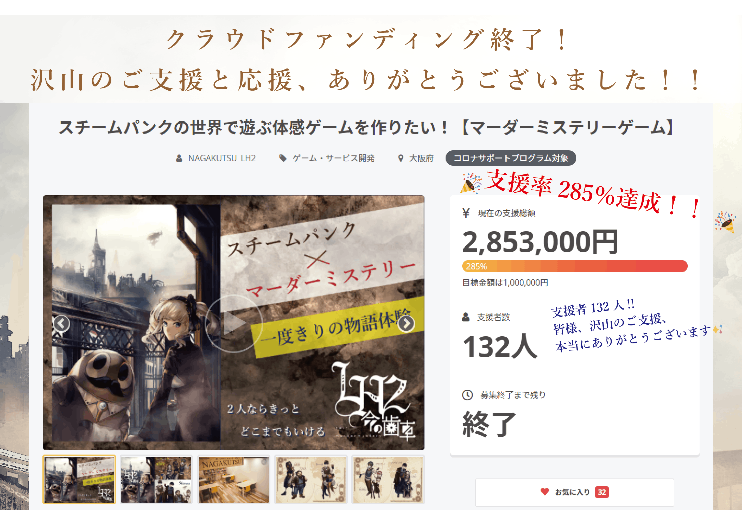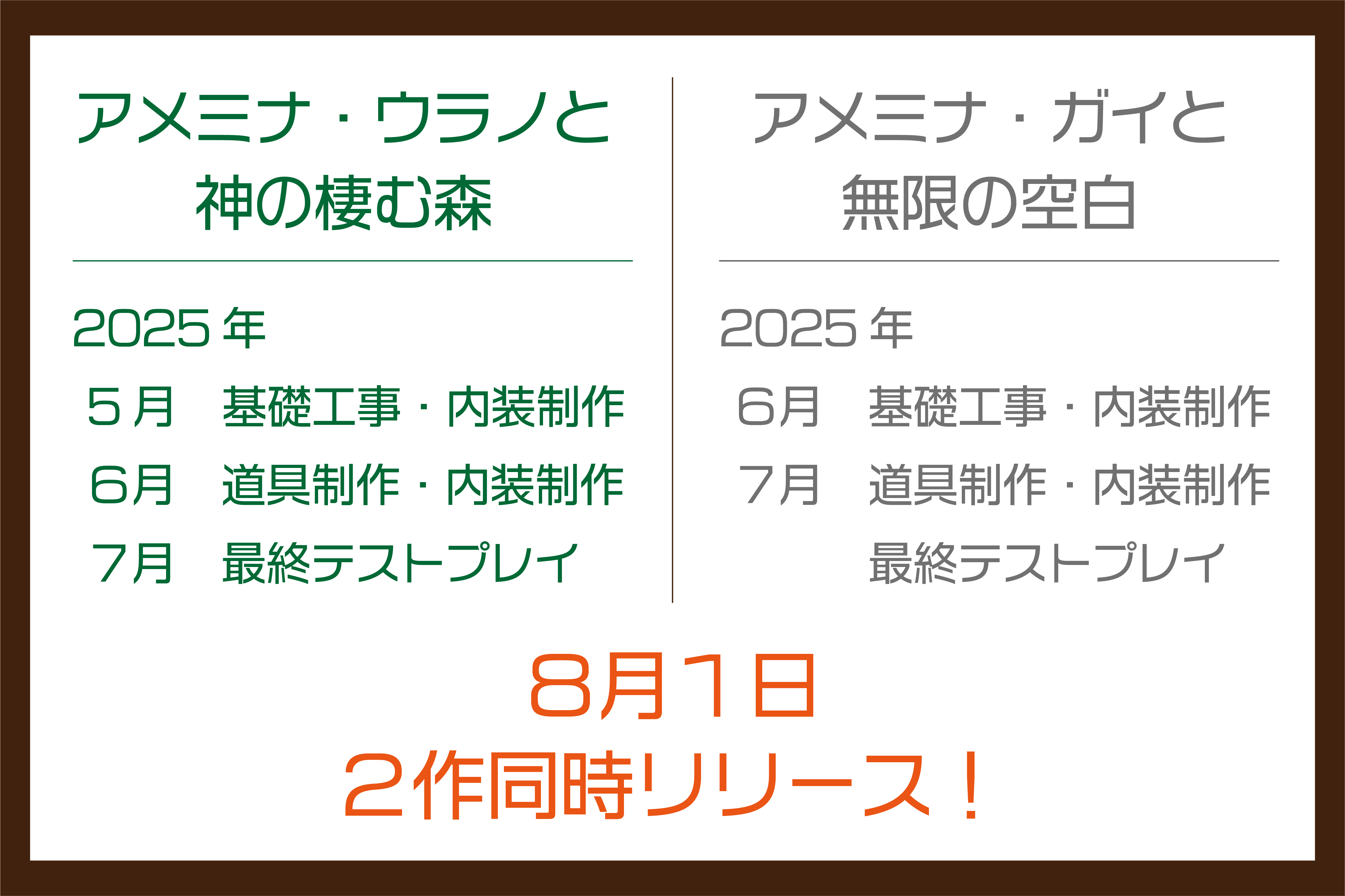 2025/07/29 23:05クラウドファンディング終了!ご支援ありがとうございました!171%達成しました!!皆様、本当に、たくさんのご支援ありがとうございました!公演開始まで残り3日間。昨日、先行体験会・GM練習公演を行い、着々と完成に近づいています!GMも既に数名ずつテストに合格しており、月末には発表される予定です。あとは、細かい誤字修正などが終われば完成!!リターン品についても、これから順次、作成していきますが、「物語の世界に名前を刻む」は、公演開始日当日より確認することが出来ます!公演チケットも発売しておりますので、ぜひ皆様遊びに来てください。チケット購入はこちら⇩『アメミナ・ウラノと神の棲む森』『アメミナ・ガイと無限の空白』詳細はこちら⇩公式HP改めて、この度は、たくさんのご支援を頂き、本当にありがとうございました!皆様の協力があってこその作品となりました。次は、神の棲む森・無限の空白で、皆様とお会いできることを楽しみにしております。 もっと見る【第5回活動報告】アメ白、部屋公開!