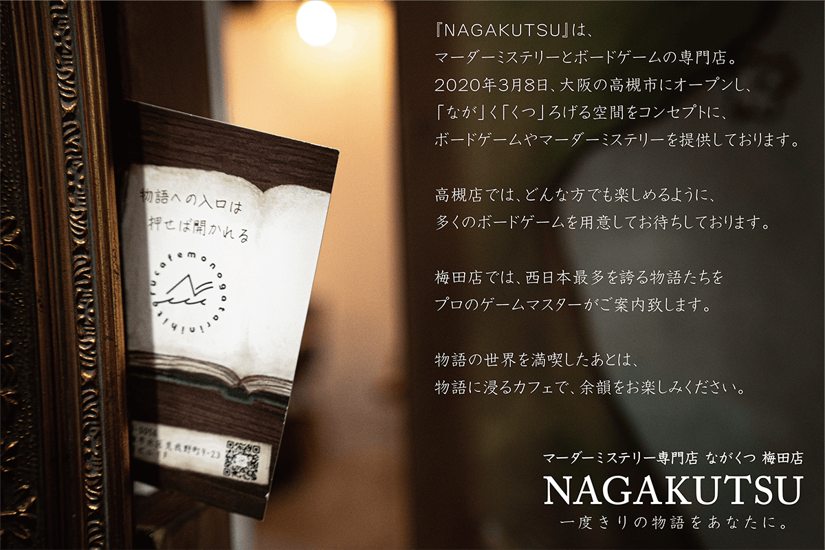 ゲームマーケット2020大阪が中止になったおりに、大阪のマーダーミステリー好きが集まり、ゲームマーケットで販売予定だった作品を販売・公演しよう!というところから始まったNAGAKUTSUが主催するマーダーミステリーイベントです。
