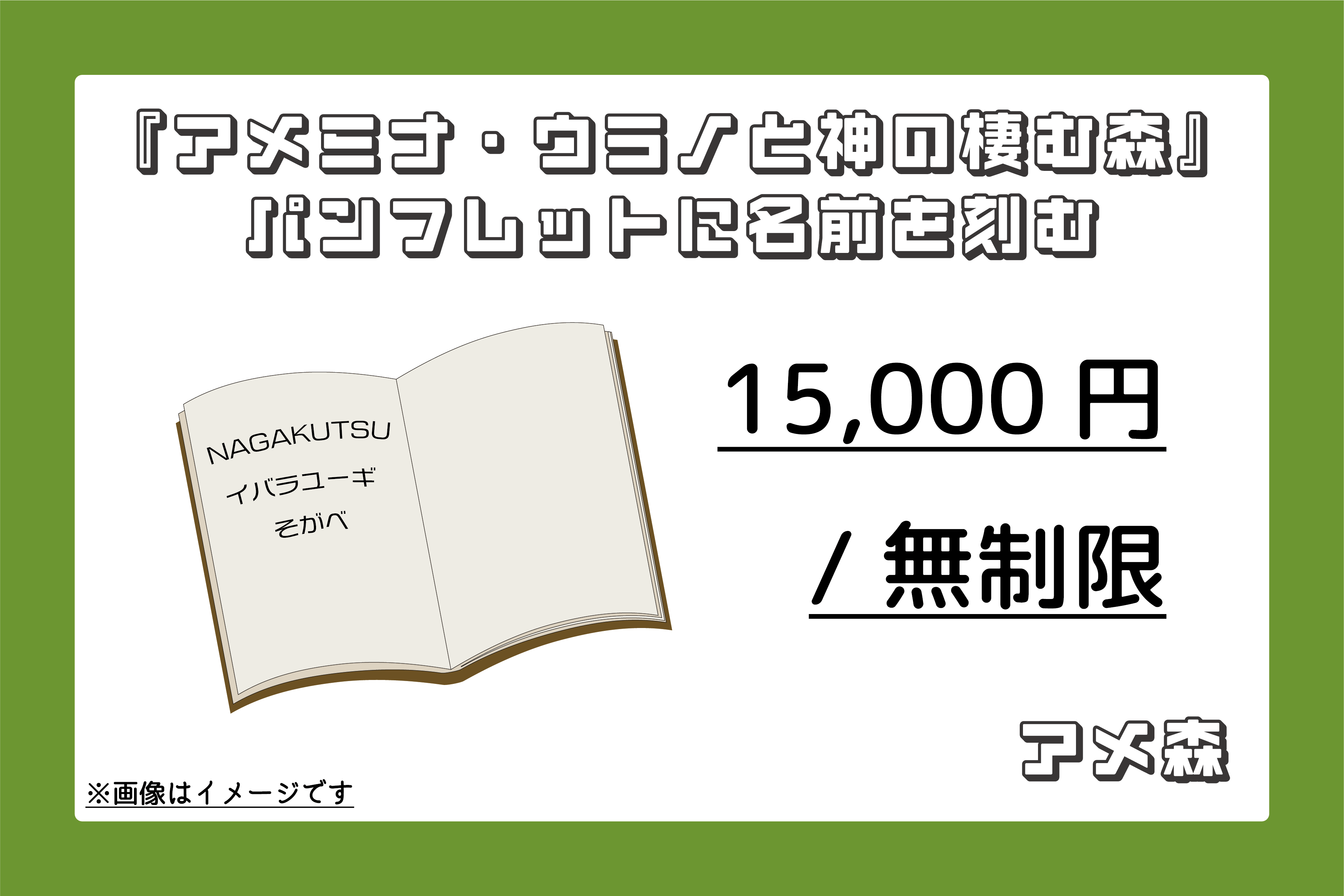 ◆『アメミナ・ウラノと神の棲む森』パンフレットに名前を刻む:15,000円/無制限