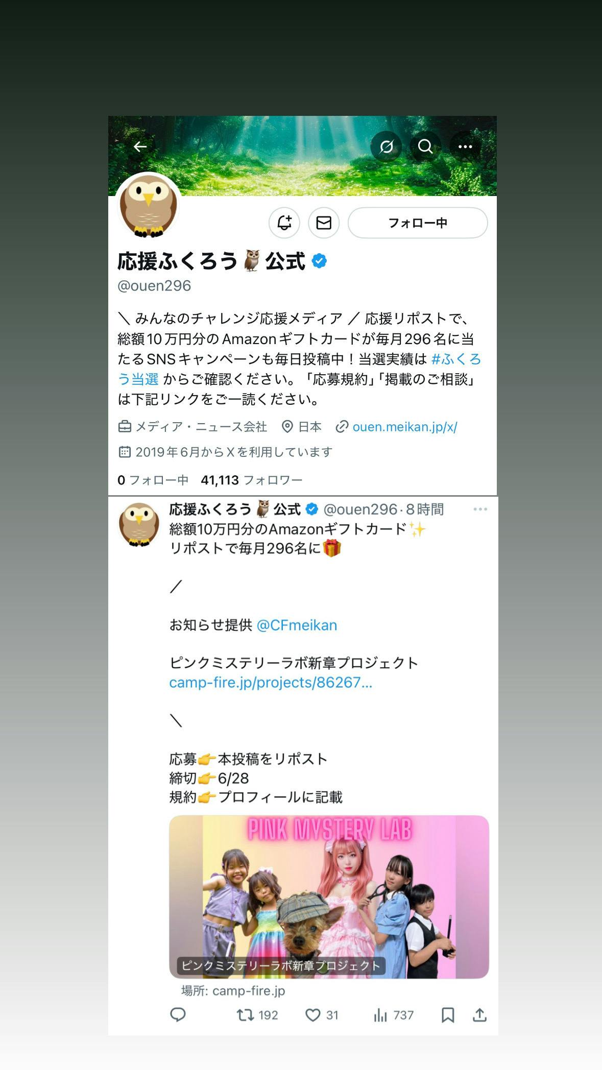【活動報告】応援ふくろう様にご紹介いただきましたこのたび、ピンクミステリーラボのクラウドファンディングプロジェクトがSNS応援メディア「応援ふくろう」公式アカウント( @ouen296 )にてご紹介いただきました。▼掲載ポストはこちらhttps://x.com/ouen296/status/1937786991401402759たくさんの方の目に届くよう、引き続き取り組んでまいります。応援してくださっている皆さま、本当にありがとうございます。