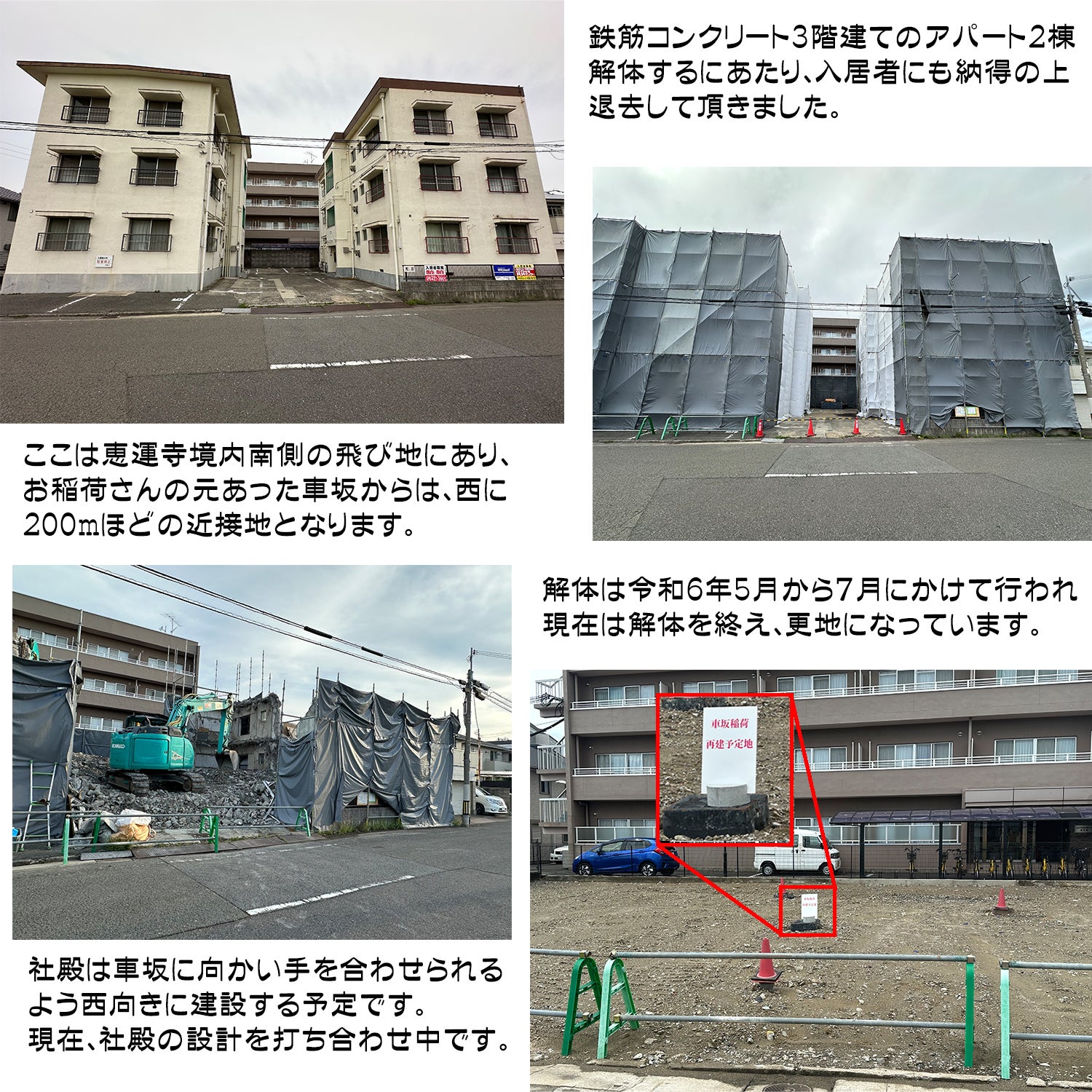 子供達、周辺住民の安全を守るため境内をなくしたお稲荷さんを復興し、再び皆さんにお祈りの場を提供すると同時に、新しい境内は皆さんの憩いの場、安心できる環境にしたいと思っています。
