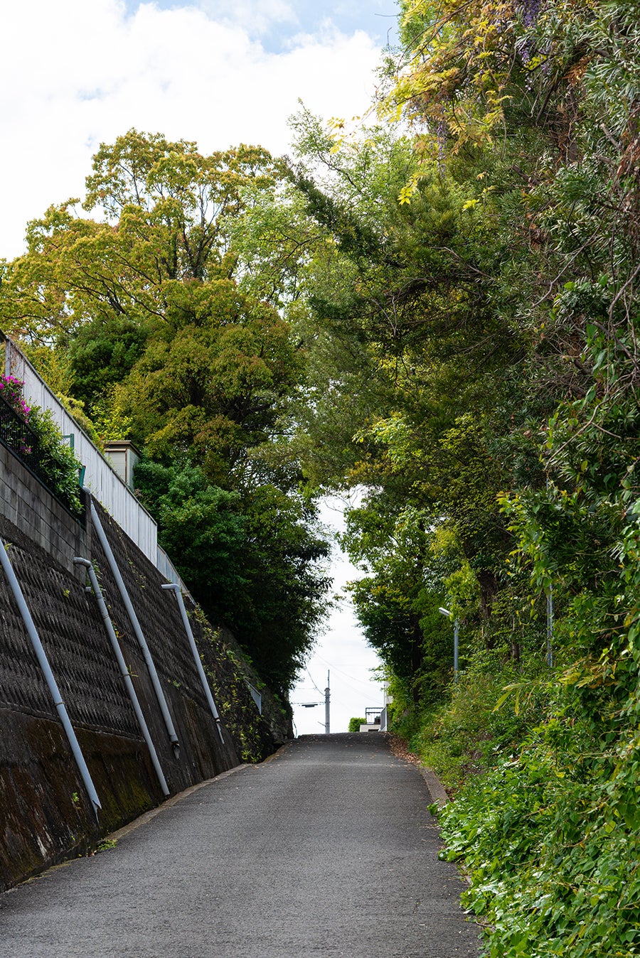 木々が茂り雰囲気は良いのですが、山を切り通しただけの市道で、近隣に桐蔭中学、高校があるため学生の通学路であったり、クラブ活動の練習であったり、周辺住民の散歩や車の抜け道にもなっていて、細い市道ながら通行人の絶えない坂道です。