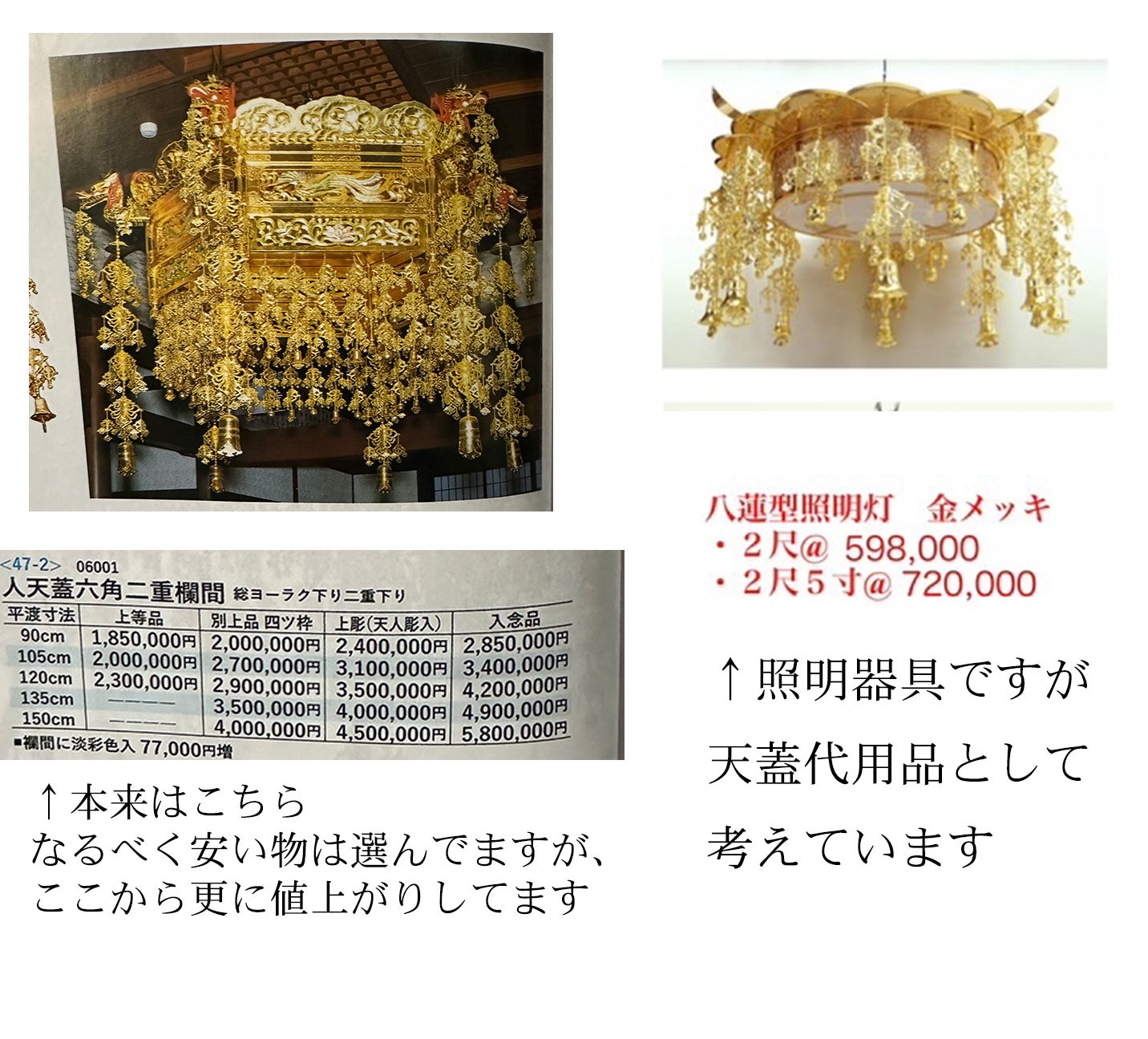天蓋には金具(真鍮や銅)、金泊などが使用されており、昨今の物価高騰により、日に日に価格が高騰しております。なるべく価格を抑えた物を選択しましても、200万円程度の金額となってしまいます。そこで、代用品として照明器具で使用できそうな物を見つけましたので、そちらの購入を目指したいと思います。堂内の広さから2尺5寸の八蓮型照明灯を設置したいと思います。72万円程の見積額となっておりますので、ネクストゴール100万円の追加で手数料と合わせ相当額となります。