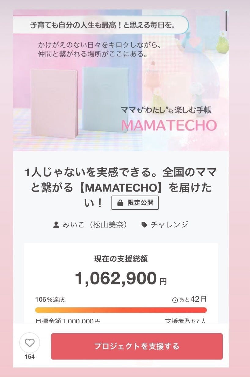 本プロジェクトをご支援くださった皆さま、そしてMAMATECHOを応援してくださるすべての皆さまへ。こんにちは、みいこです!!/1人じゃないを実感できる。全国のママと繋がるMAMATECHOを届けたい!\このたび、クラウドファンディング開始からわずか1週間で、ネクストゴールである200万円を達成いたしました。。。!!!!本当に、本当に、本当にありがとうございます。。。!!!ひとつひとつの応援メッセージ、あたたかいシェアやご支援の数々。すべてが私の背中を押してくださり、言葉にできないほどの感謝の気持ちでいっぱいです。この挑戦を通して、改めてMAMATECHOへの皆さまの大きな期待、そして【ママたちは1人じゃない】ということを改めて強く実感しました。一緒にプロジェクトを進めたメンバーもママが多いです。この活動を、心から応援してくれる方のママへの愛。来年版のMAMATECHOでは、全国のママたちが安心してつながりを感じられるよう、毎月のオンライン振り返り会など、コミュニティの輪を広げていきます。そして次の目指す先は、「子育ても自分の人生も楽しみ尽くすママを増やすため、MAMATECHOを届けたい」という想いを胸に、1000冊を全力でお届けさせて頂きます!!そのために追加リターンでは、子育て支援団体様やママのためのご支援を精力的に行っていらっしゃる企業様への寄贈プランをご用意しています。そのほか、現時点でお手に取って頂いている支援者様にお楽しみいただけるようなイベントを複数ご用意しているので、詳細をぜひ楽しみにして頂けたら嬉しいです!手帳を書くことで、ママの人生がもっと輝き、子どものことがもっと愛おしくなり、そして、自分のことも大好きになれる。そんなママをこの手帳から増やしていけるよう、これからも心を込めて活動していきます。引き続き、温かい応援をどうぞよろしくお願いいたします。感謝を込めて。松山美奈