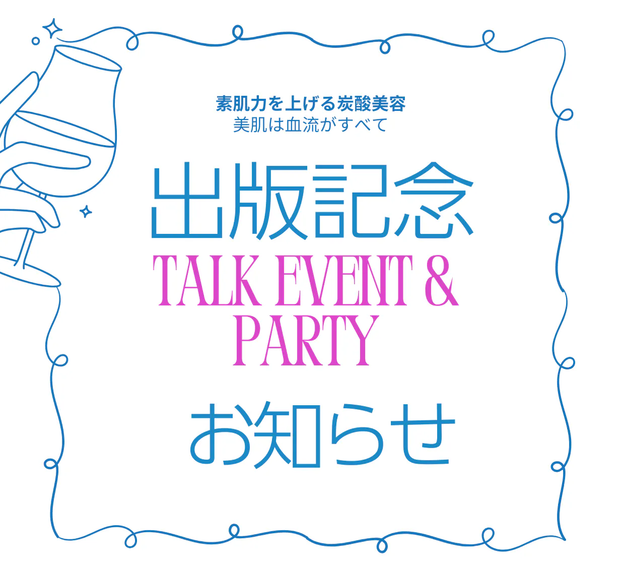 2025/09/24 20:00<出版パーティーおよびトークイベントにご支援の皆様>メールが届いていないなどのお声がありこちらに最終案内をさせていただきます。このたびは、トークイベント・パーティーにお申し込みいただきありがとうございます。当日、直接お会いできることを心より楽しみにしております。両方参加される方、またそれぞれに参加される方といらっしゃいますのでお時間間違えないようにいらしてください。▼当日のご案内16:00〜17:30 出版記念トークイベント(15:45開場です)18:00〜20:00 出版パーティー(着席)会場:Le chic unjour(ラシック アンジュール)〒104-0061 東京都中央区銀座2-3-6 並木通りビル6階TEL:03-6263-0509 / FAX:03-6263-0519緊急連絡先:080-4260-5389当日は、トークでは出版裏話や炭酸美容の秘密についてたっぷりお話しし、パーティーでは美味しいお料理と交流の時間をご用意しています。どうぞ楽しみにお越しください。尚、本イベントのテーマカラーは炭酸の青と血流の赤です。小物やアクセサリーなどどんなアイテムでも構いませんので、青系、赤系(ピンクやオレンジもOK)何かひとつイベントカラーを取り入れてご参加いただけると嬉しいです。(強制ではありません)では会場でお会いしましょう!炭酸美容家 髙橋弘美スタッフ一同 もっと見る出版記念セットをお届けしています